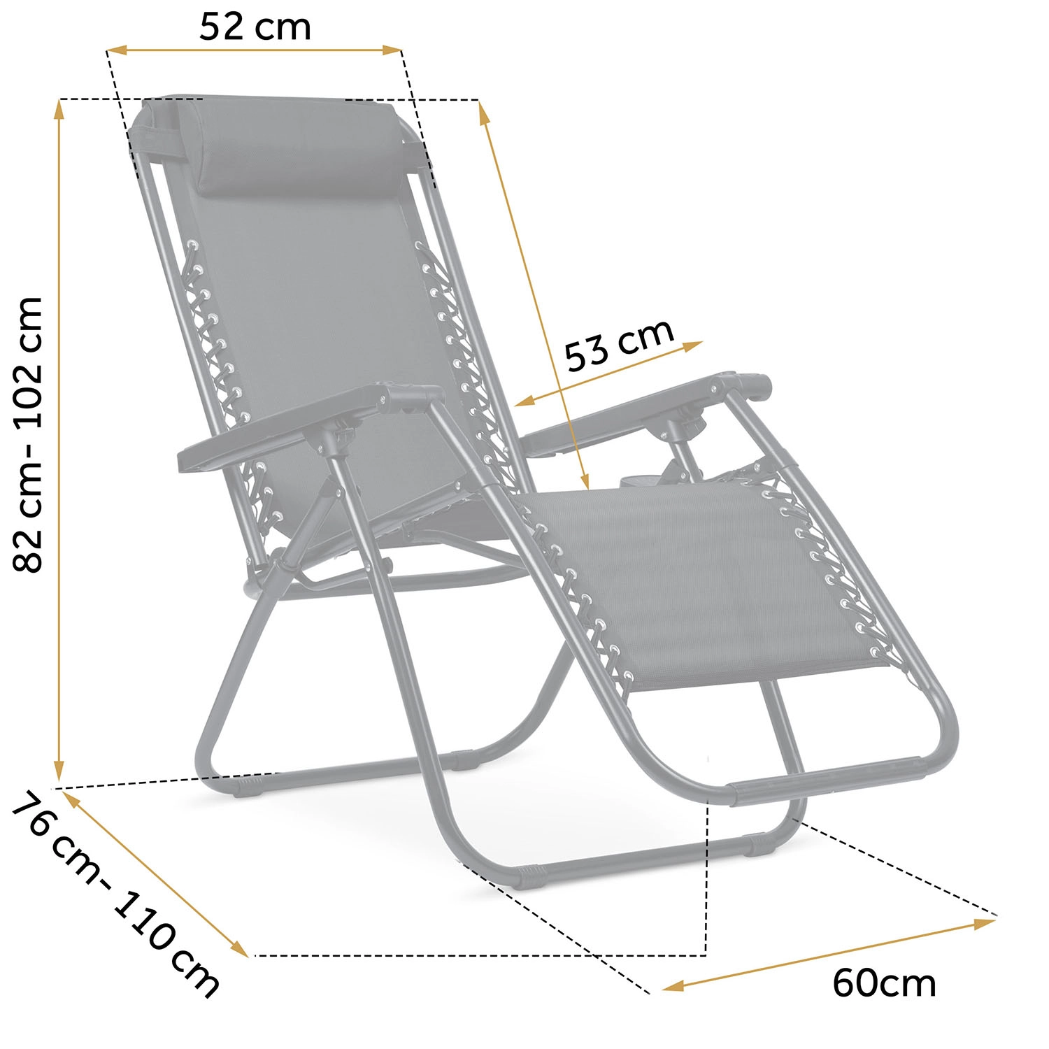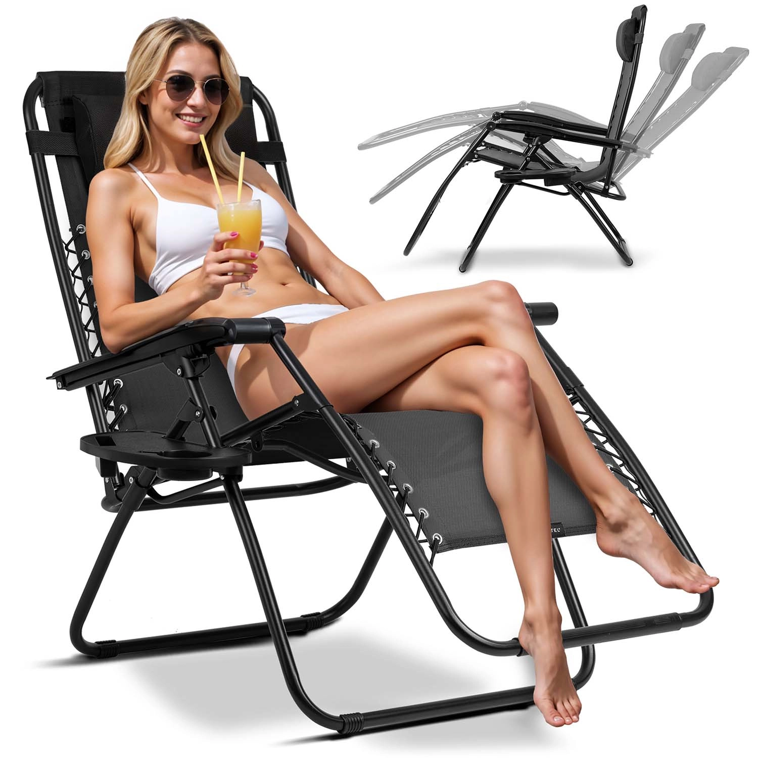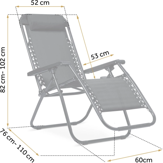 Dla Twojej wygody przewidziano miękki zagłówek, boczny stolik na napój, książkę lub telefon oraz 3 poziomy nachylenia z łatwą blokadą. Poszycie z wodoodpornej i odpornej na UV tkaniny textilene jest oddychające, szybko schnie i łatwo się czyści, a stalowa rama malowana proszkowo gwarantuje wysoką stabilność.
