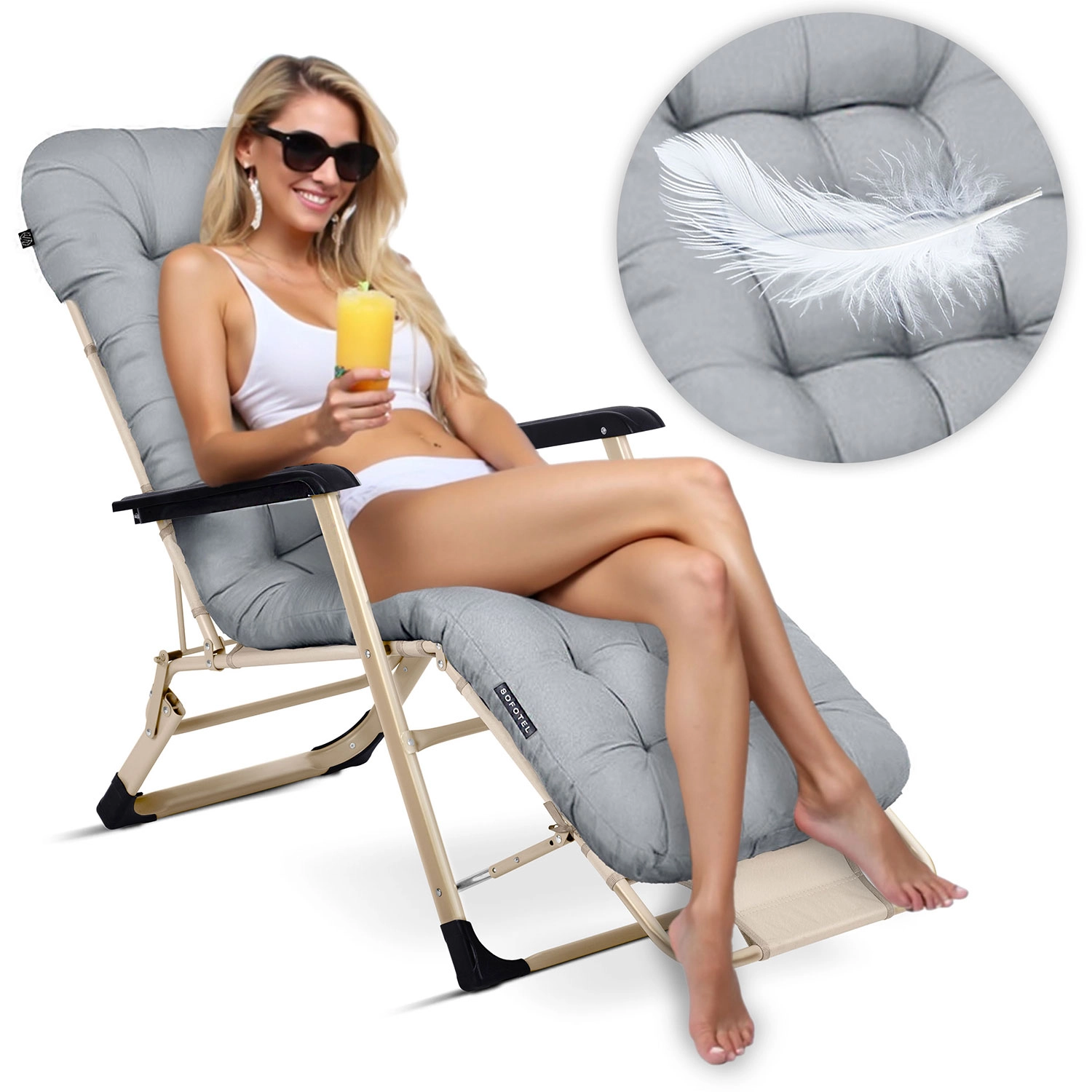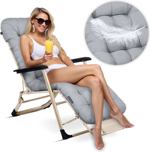 Leżaki Sofotel ChillWell zaprojektowano z myślą o pełnym komforcie wypoczynku na świeżym powietrzu. Grubo wypełniona, pikowana poduszka jest przyjemna w dotyku i zapewnia elastyczne podparcie ciała, a regulowany mechanizm pozwala płynnie przejść do pozycji całkowicie leżącej dla maksymalnego relaksu i lepszego ukrwienia nóg.