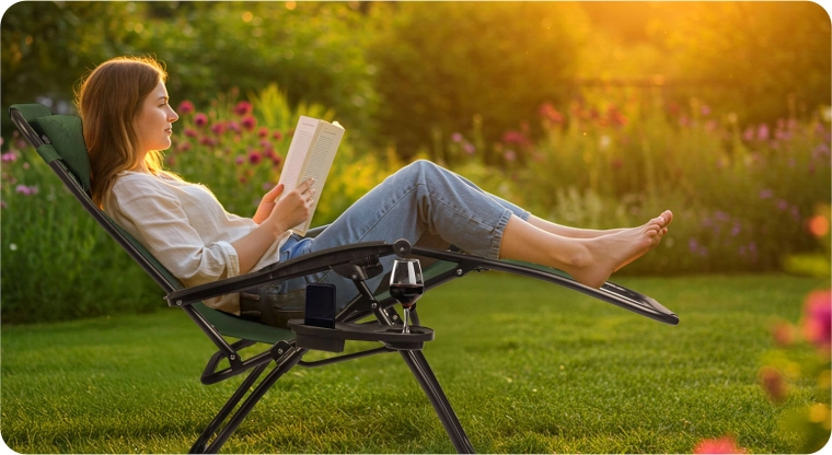 Odkryj lekkość wypoczynku, jakbyś unosił się w stanie nieważkości. Leżaki grawitacyjne ChillWell pozwalają unieść nogi na wysokość serca, co sprzyja lepszemu krążeniu i odciążeniu kręgosłupa. Ergonomiczna konstrukcja z regulowanym oparciem i wygodnymi podłokietnikami zapewnia maksymalny komfort w ogrodzie, na tarasie, balkonie i w podróży.