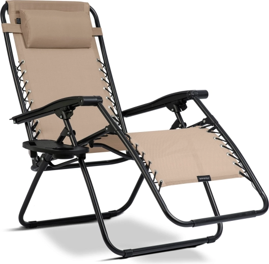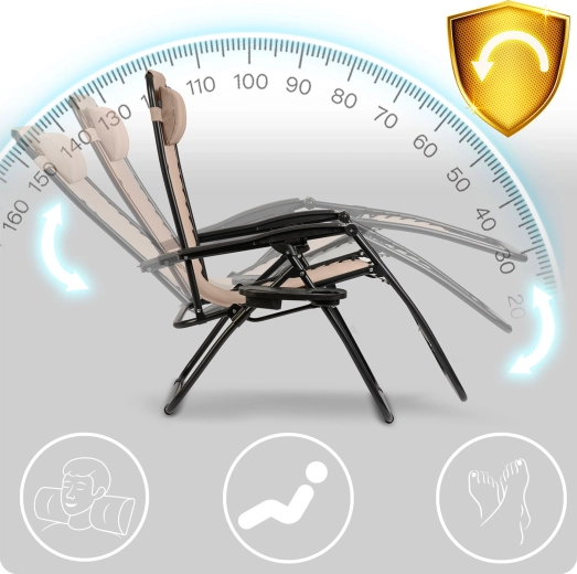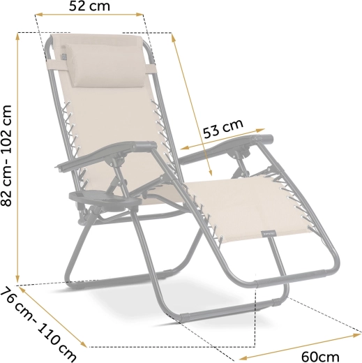 Praktyczne wyposażenie obejmuje odpinaną poduszkę pod głowę oraz boczny stolik z uchwytami na napoje i miejscem na telefon lub drobiazgi – wszystko masz wygodnie pod ręką. Stabilna stalowa rama z powłoką proszkową oraz linki napinające gwarantują pewne siedzenie i leżenie do 120 kg.