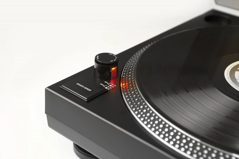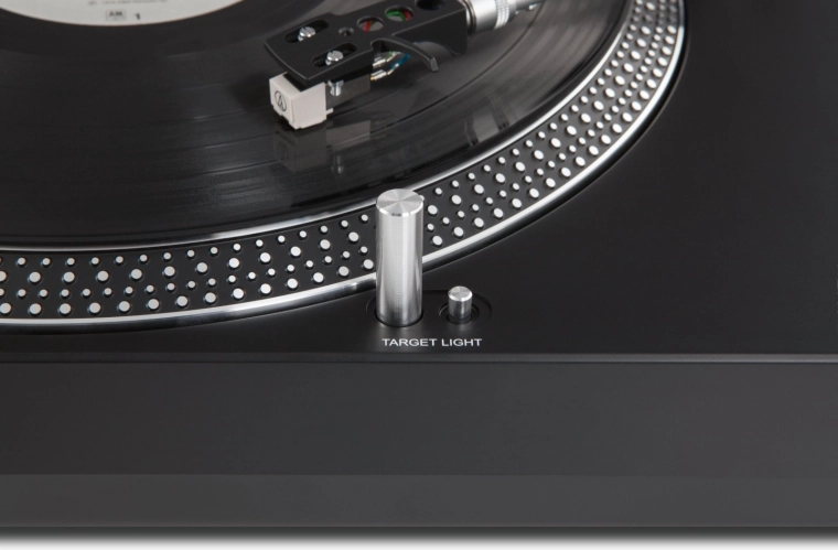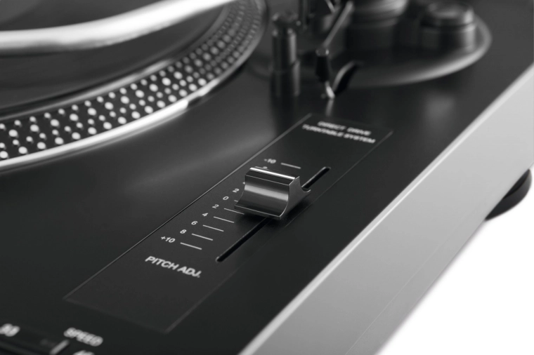 - Bezpośredni napęd sterowany kryształem dla stabilnych obrotów i zastosowań DJ.