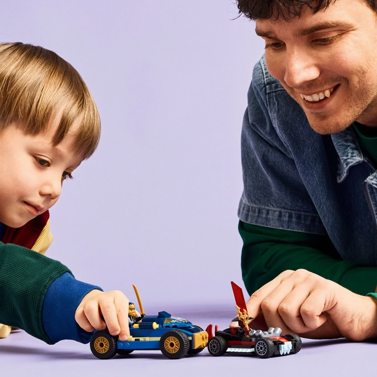 Ten kolorowy zestaw inspirowany 3. sezonem serialu NINJAGO: Powstanie smoków oferuje wszystko do pełnych adrenaliny pościgów i bitew. Dzieci zbudują samochód ninja z miotaczami oraz pojazd złoczyńców i natychmiast ruszą do zabawy dzięki kostce startowej, która przyspiesza i ułatwia pierwsze kroki.