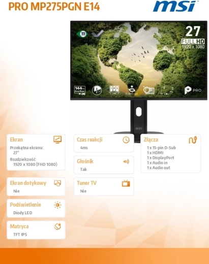 MSI PRO MP275PGN zapewnia zrównoważony stosunek jakości do wygody. Zakrzywiony panel wciąga w akcję, wysoka częstotliwość odświeżania 144 Hz gwarantuje wyjątkowo płynny obraz, a rozdzielczość Full HD oferuje ostre detale do codziennej pracy, multimediów i mniej wymagających gier.