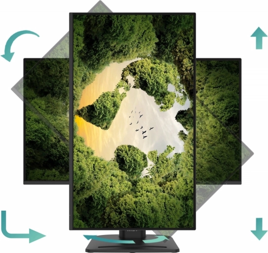 Ergonomiczny stojak pozwala na regulację wysokości, pochylenia i obrotu (pivot), dzięki czemu łatwo dopasujesz monitor do swojego stanowiska. Cienkie ramki i mocowanie VESA sprzyjają czystym i elastycznym konfiguracjom, a zintegrowane prowadzenie kabli utrzyma porządek na biurku.