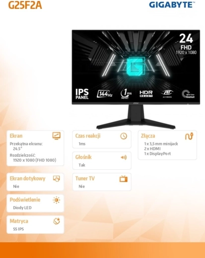 GIGABYTE AORUS G25F2A oferuje najwyższej klasy 24,5" panel IPS z ostrym obrazem w Full HD, wiernymi kolorami i szerokimi kątami widzenia. Dzięki częstotliwości odświeżania 240 Hz i błyskawicznemu czasowi reakcji jest idealny do rozgrywek konkurencyjnych, gdzie liczy się każda milisekunda.