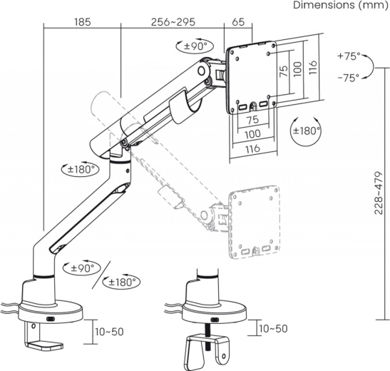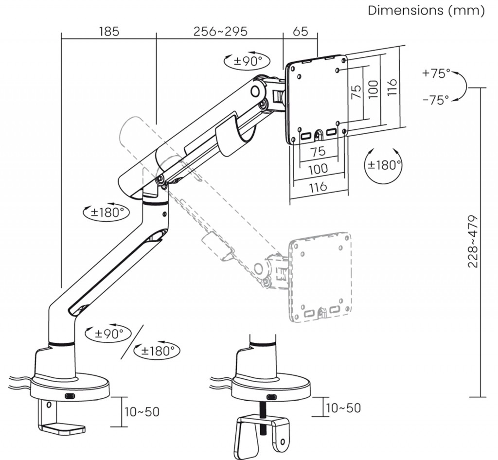 Ramię obsługuje monitory 17–35" o wadze 2–11 kg i rozstawie VESA 75×75 lub 100×100. Szeroki zakres ruchu obejmuje pochył od -75° do +75°, obrót ±180° oraz możliwość pivotu do szybkiego przełączania między orientacją poziomą i pionową.