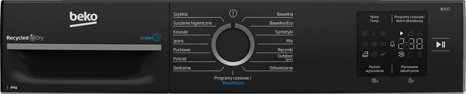 - EcoGentle: innowacyjne połączenie kondensacji i kontroli temperatury dla delikatnego i energooszczędnego suszenia bez blaknięcia.