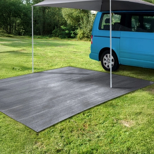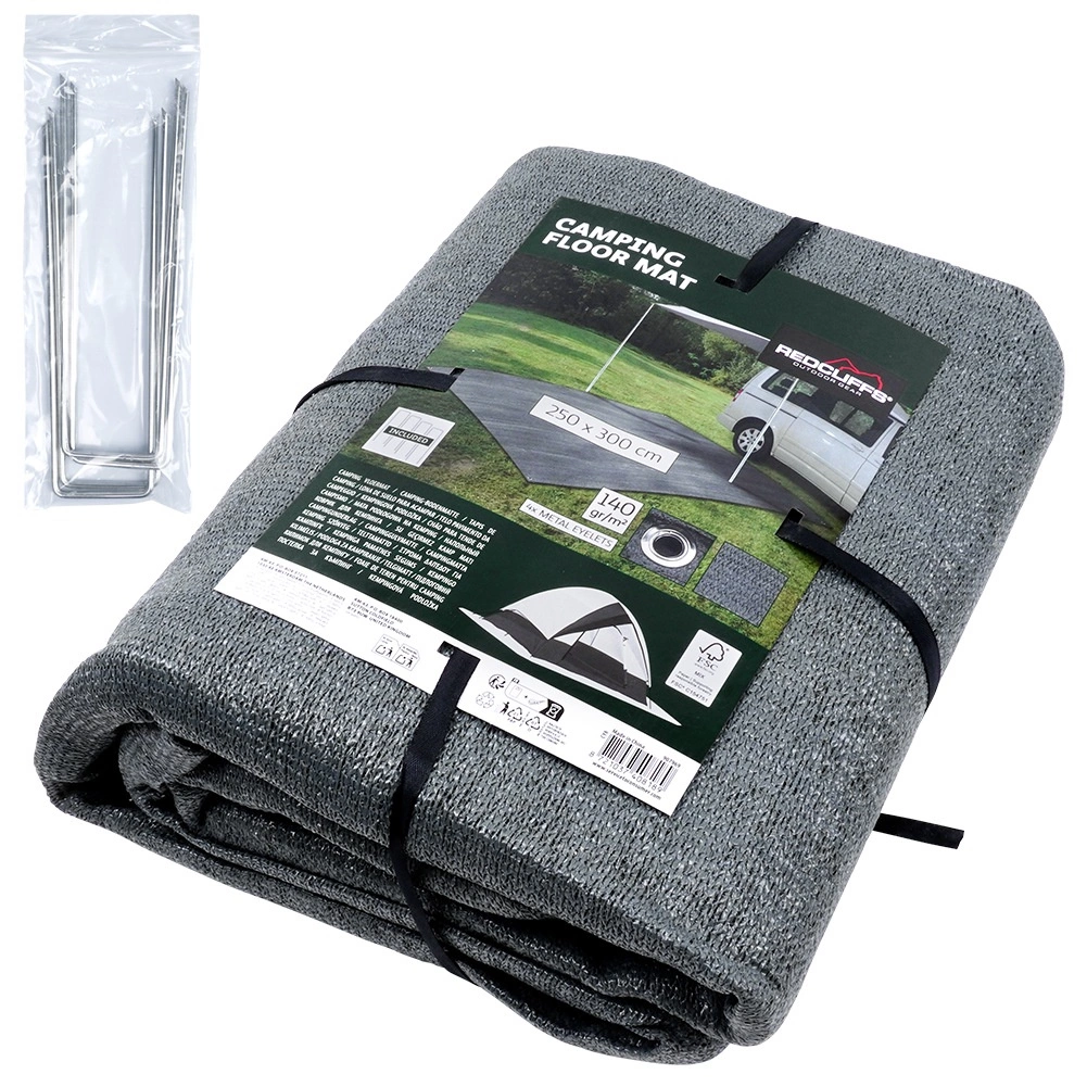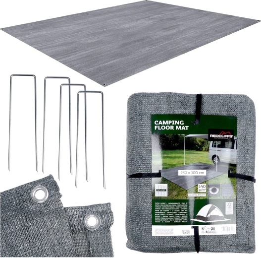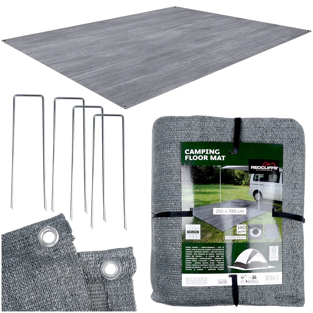 Praktyczna mata podłogowa do namiotu i przedsionka o wymiarach 250 × 300 cm zapewni podczas biwakowania czystość, sucho i większy komfort. Wykonana z trwałej i łatwej do mycia tkaniny siatkowej w kolorze szarym, posiada metalowe oczka do zakotwienia, a w zestawie znajdziesz także 4 kołki do stabilnego mocowania. Odpowiednia również pod markizę kampera, do altany, na plażę czy piknik.