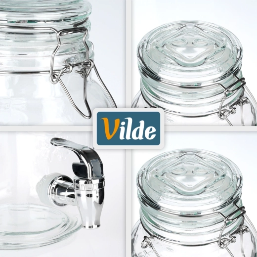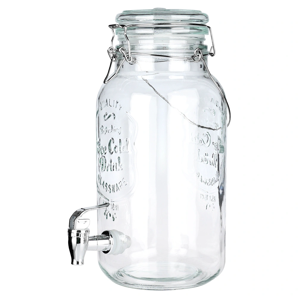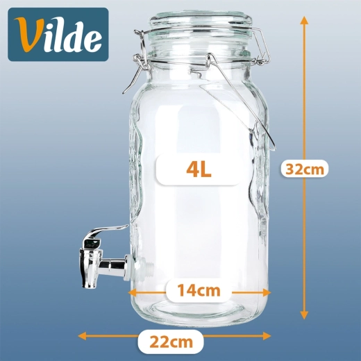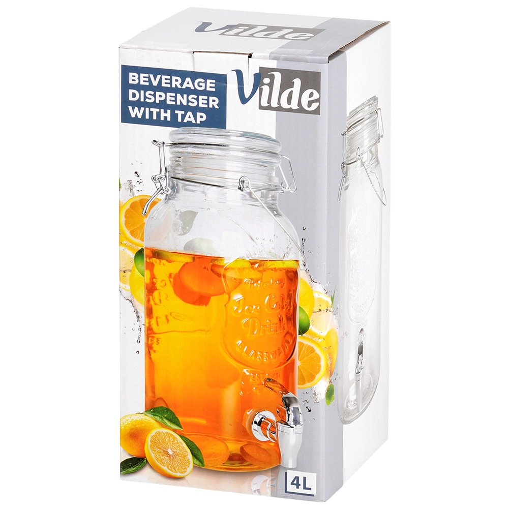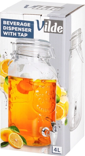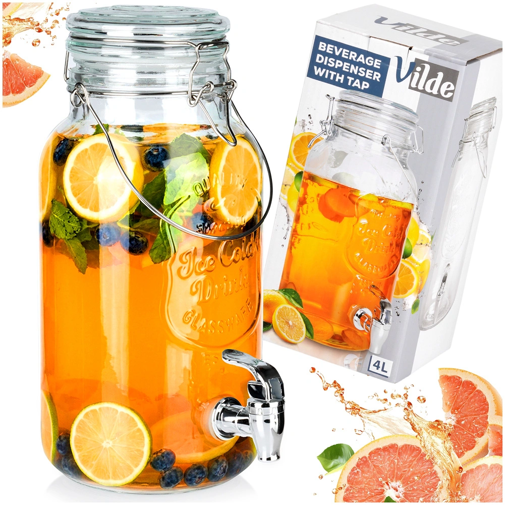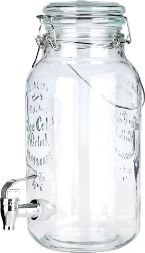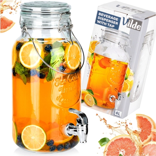 Stylowy szklany dyspenser o pojemności 4 l z metalowym kranikiem i szczelną pokrywą jest idealny do serwowania lemoniady, wody z owocami, ponczu czy mrożonej herbaty. Dzięki szerokiemu wlewowi łatwo się go napełnia i czyści, solidny uchwyt ułatwia przenoszenie, a zatrzaskowe zamknięcie chroni napój przed owadami.