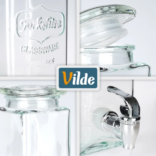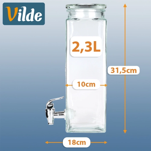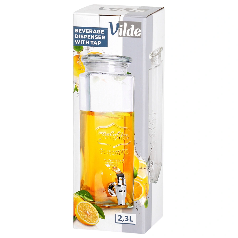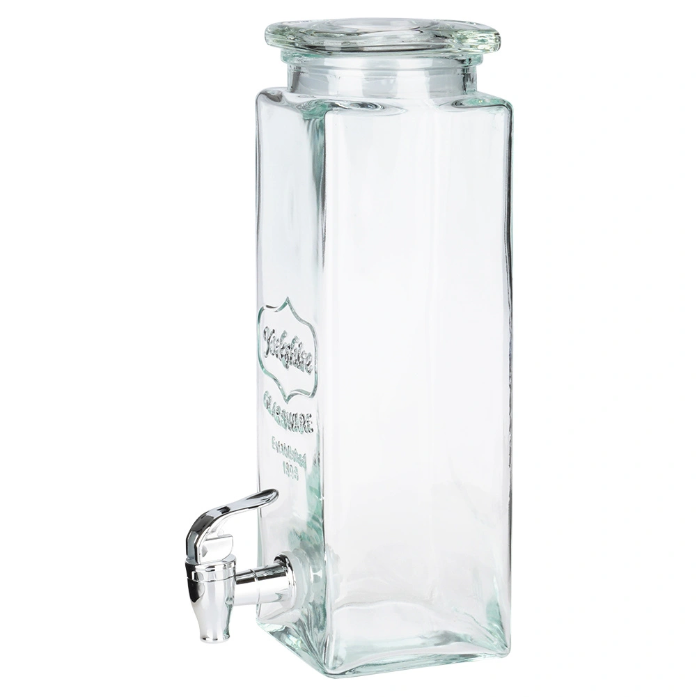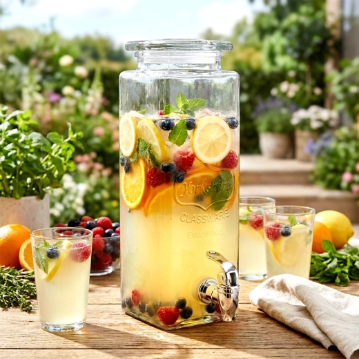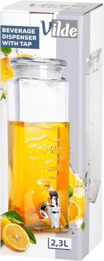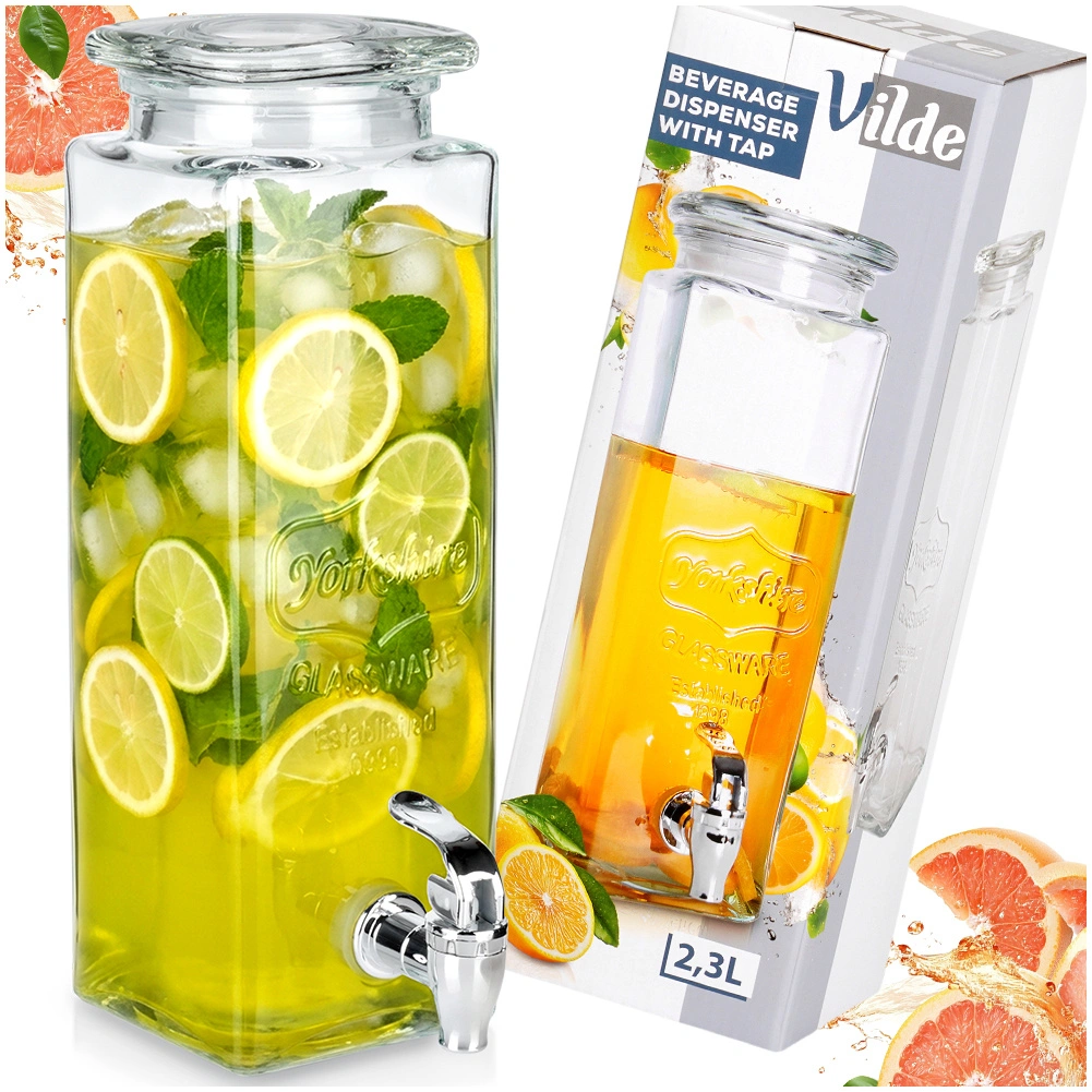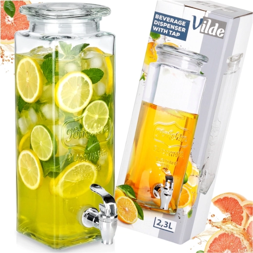 Szklany dyspenser do napojów o pojemności 2,3 l jest perfekcyjny do orzeźwiających lemoniad, wody z cytrusami i miętą, domowych soków lub ponczu. Elegancji dodaje przezroczyste grube szkło z reliefowym napisem oraz kranik w metalicznym wykończeniu, który umożliwia wygodne i kontrolowane nalewanie bez rozlewania. Pokrywa z uszczelką chroni napój przed zanieczyszczeniami i owadami, dzięki czemu sprawdzi się w domu i na tarasie.