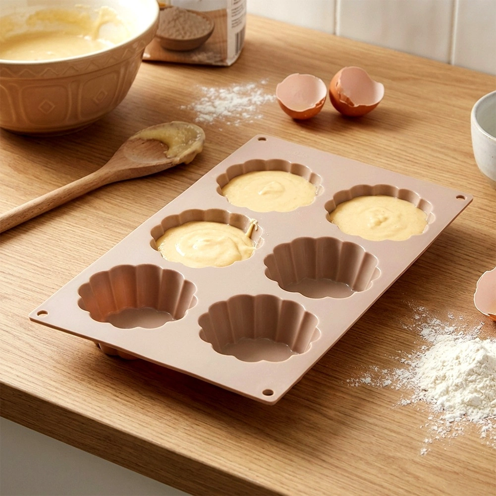 Ta beżowa silikonowa forma z 6 kwiatowymi kształtami jest idealna do codziennego pieczenia i odświętnych deserów. Wymiary formy 30 × 17,5 × 3 cm oraz wielkość pojedynczego zagłębienia 7,5 × 3 cm są perfekcyjne na „w sam raz” porcje. Silikon jest lekki, elastyczny i dobrze przewodzi ciepło, dzięki czemu wypieki pieką się równomiernie i bez konieczności natłuszczania.