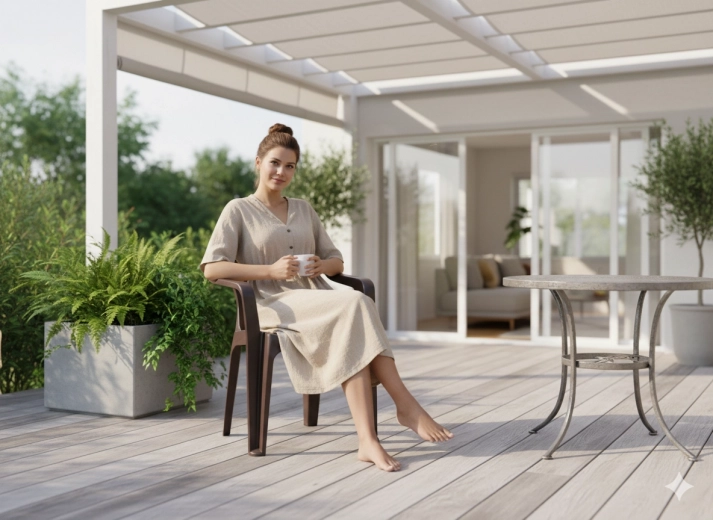 Solidna, czteronożna konstrukcja z tworzywa zapewnia stabilność, a niska waga ułatwia przenoszenie i przechowywanie na tarasie lub w ogrodzie.