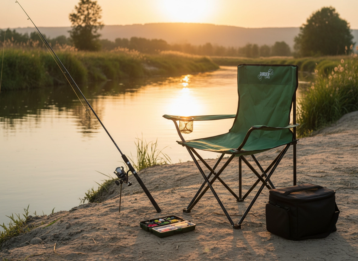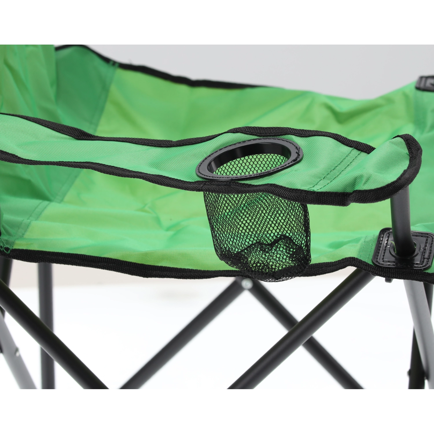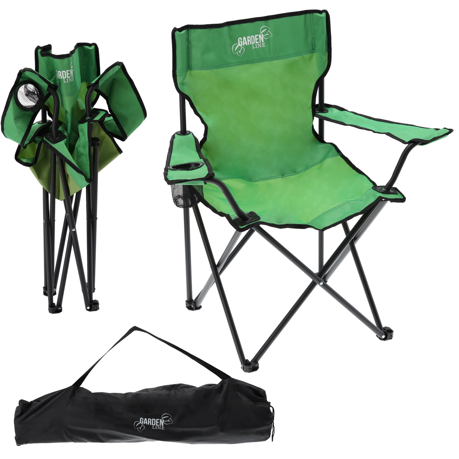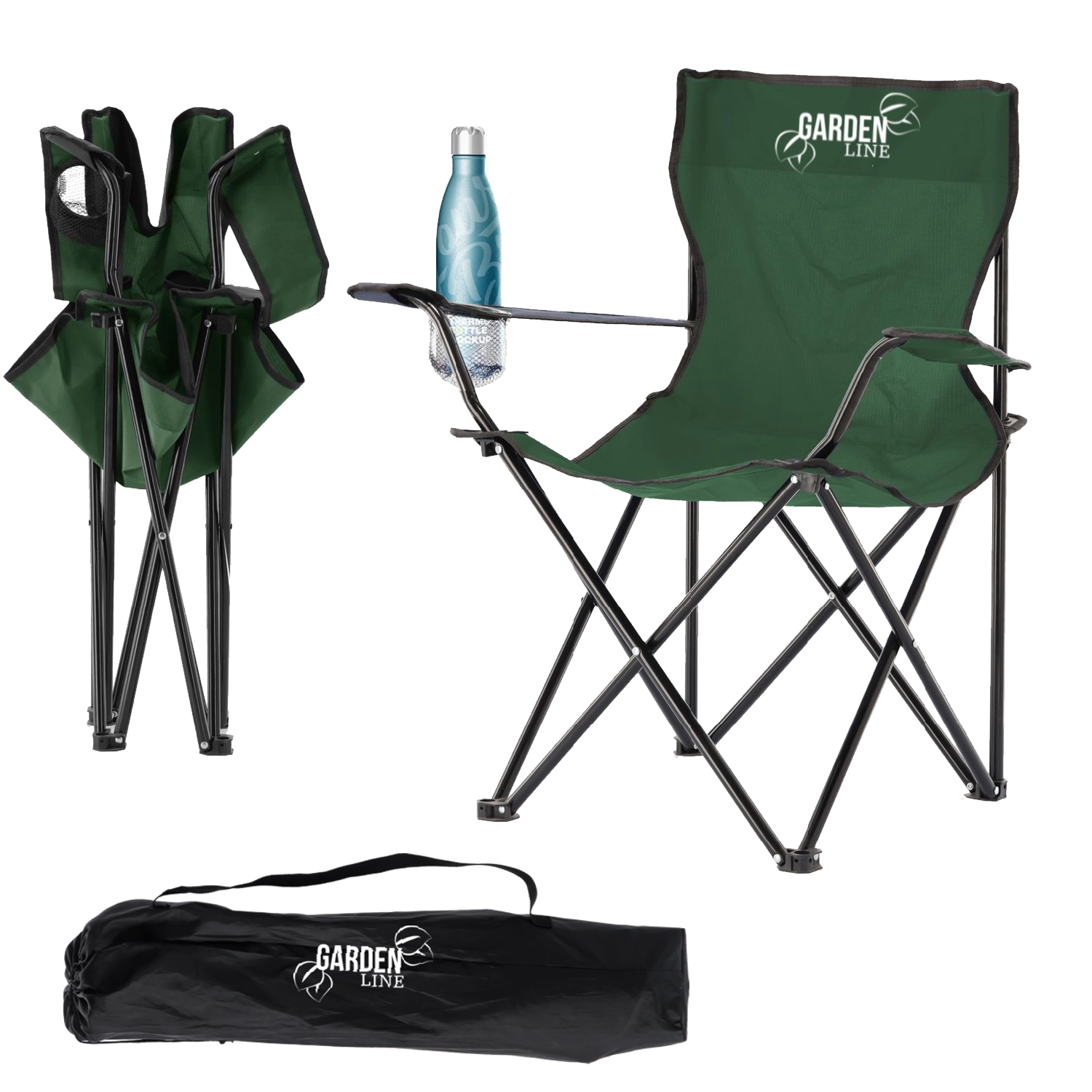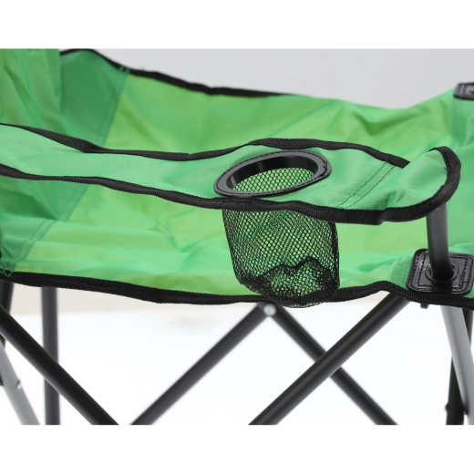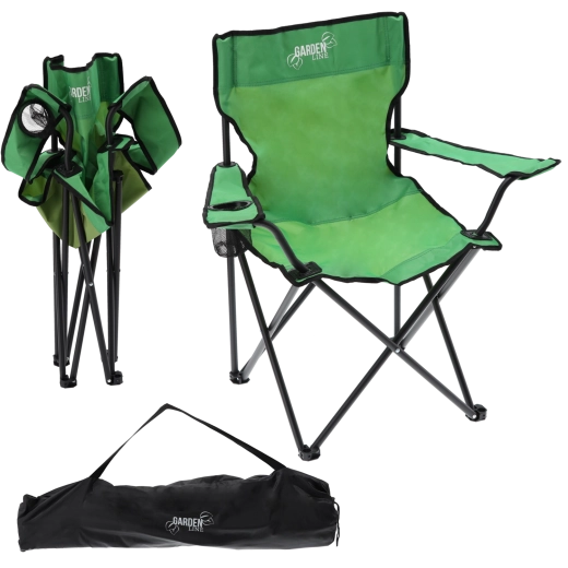 Praktyczne składane krzesło kempingowe w zielonym kolorze do wygodnego siedzenia nad wodą i podczas wycieczek. Oferuje solidną stalową konstrukcję, wytrzymałą tkaninę 600D Oxford oraz zintegrowany uchwyt na napój. W zestawie znajduje się worek transportowy ułatwiający noszenie.