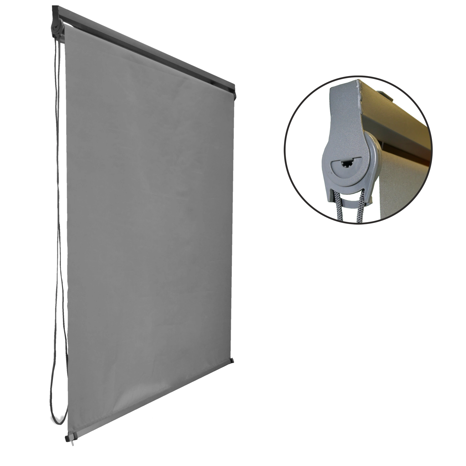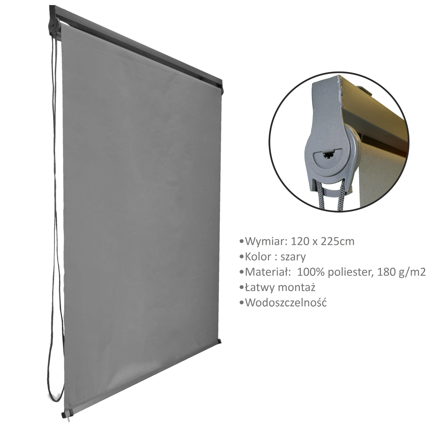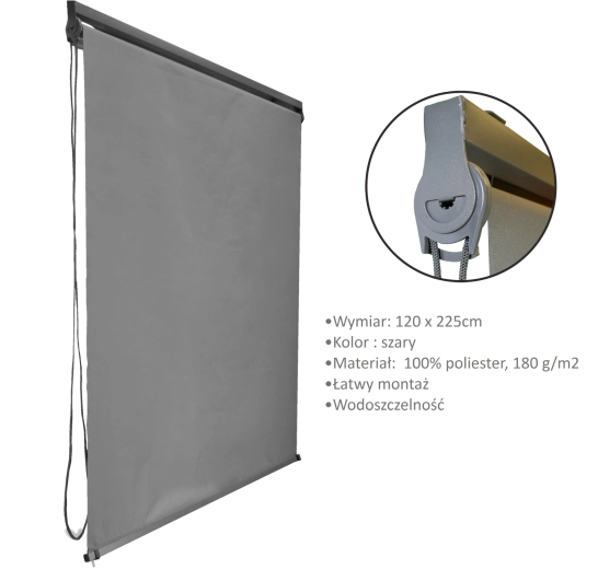 Ta zewnętrzna roleta to idealne rozwiązanie dla pergoli, tarasów i ogrodowych altan. Solidna poliestrowa tkanina w stylowym, szarym kolorze skutecznie filtruje promienie słoneczne i pomaga utrzymać przyjemną temperaturę nawet w upalne dni.