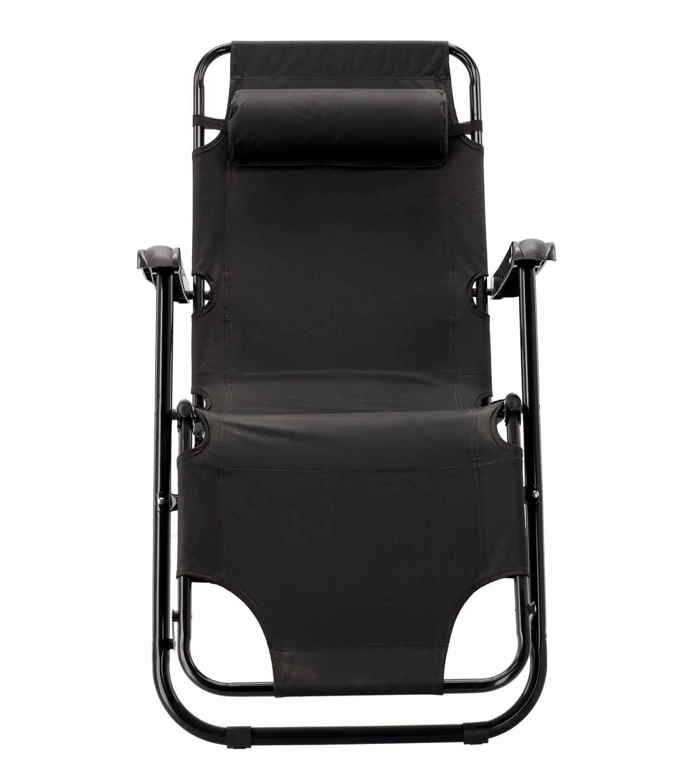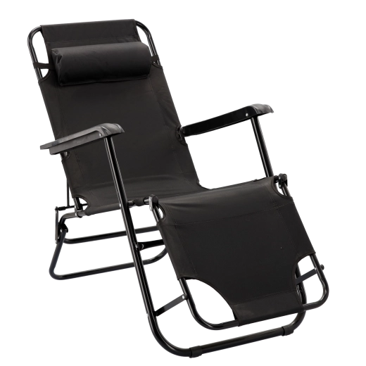 Praktyczny składany leżak ogrodowy w eleganckim czarnym kolorze jest idealny na taras, do ogrodu i w podróż. Dzięki metalowej ramie malowanej proszkowo jest stabilny i wytrzymały, a oddychająca tkanina zapewnia komfort nawet w upalne dni. Poduszkę pod głowę można łatwo wyregulować lub zdjąć.