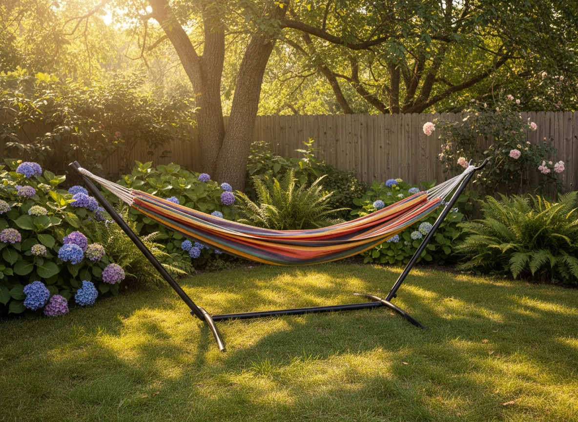 Wolnostojąca rama pozwala zawiesić hamak w ogrodzie, na tarasie czy na trawniku – bez wiercenia i szukania odpowiednich punktów kotwiących.