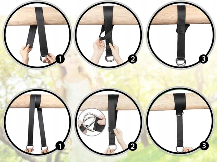 Owiń pas wokół gałęzi lub belki, przewlecz i zabezpiecz karabińczykiem. Prosta procedura, z którą każdy poradzi sobie bez użycia narzędzi.