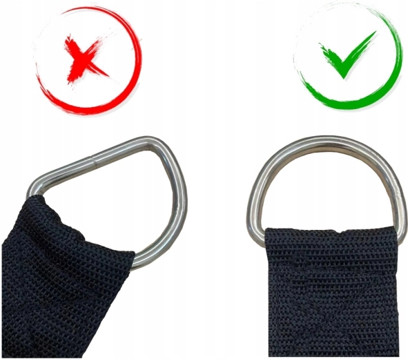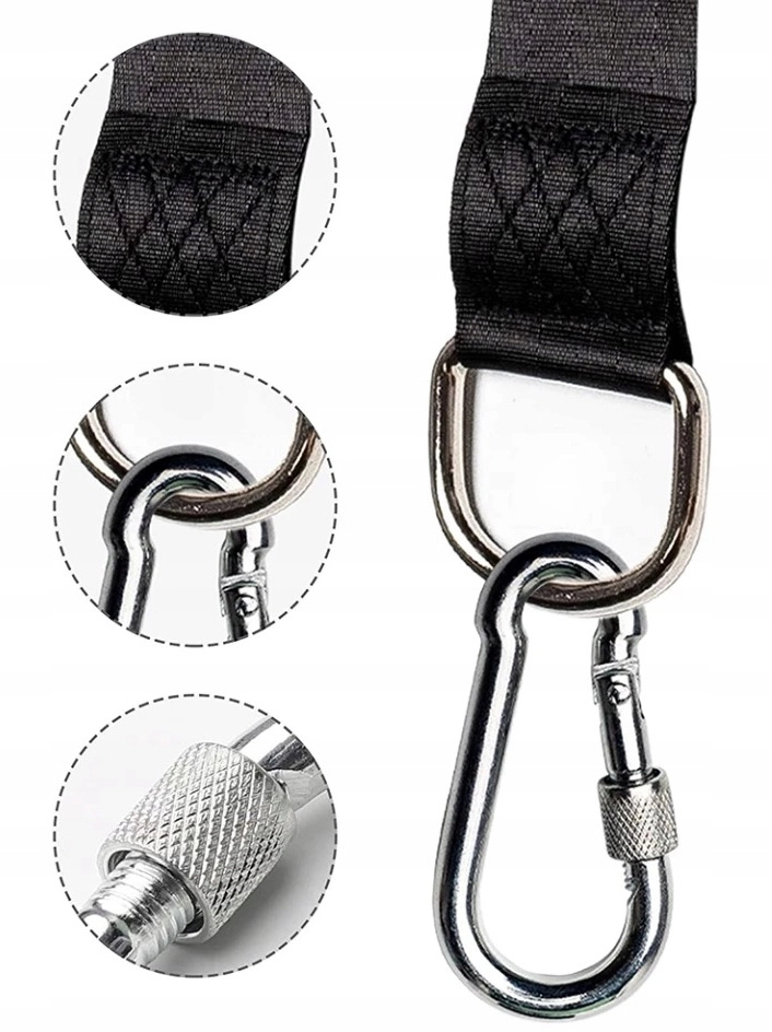Mocne pasy z metalowymi pierścieniami D oraz karabińczykami z zakręcanym zamkiem zapewniają pewność nawet przy dużym obciążeniu do 1000 kg.