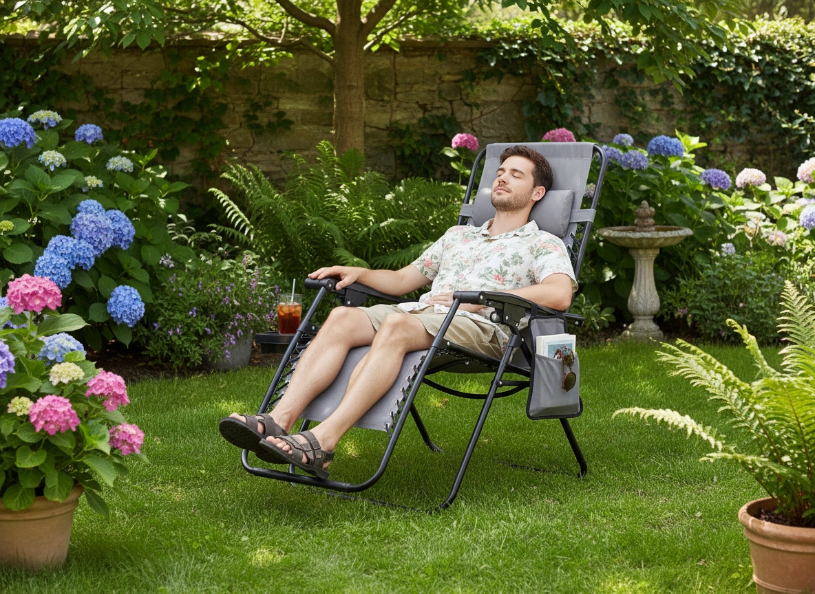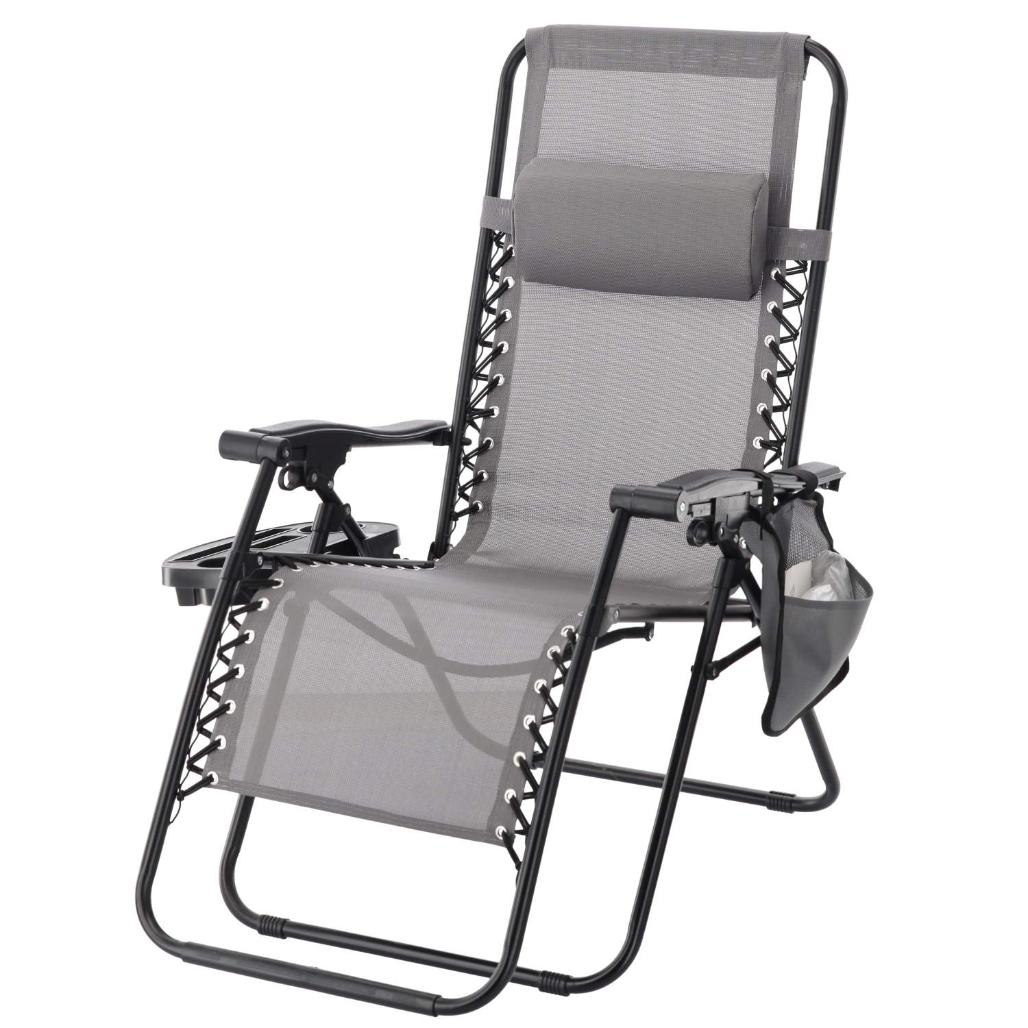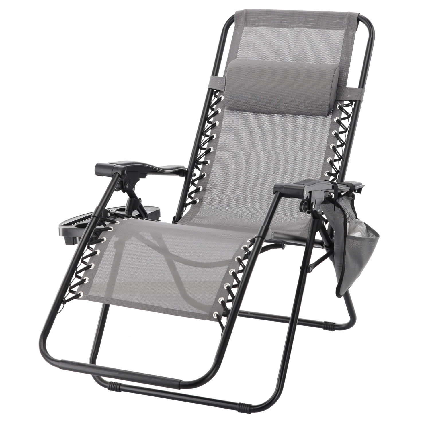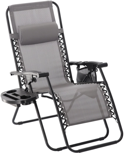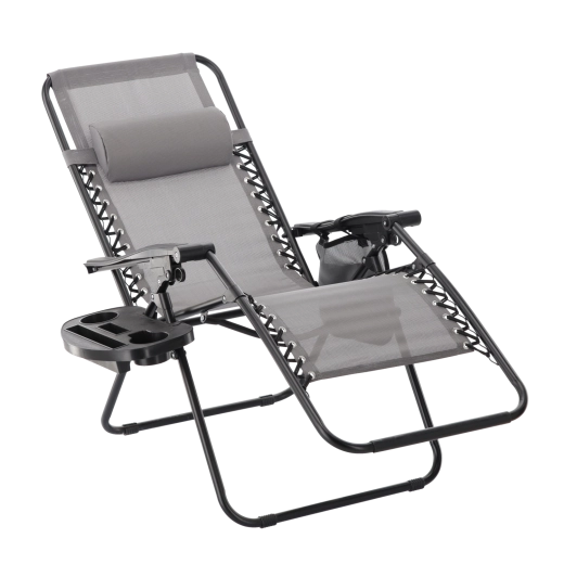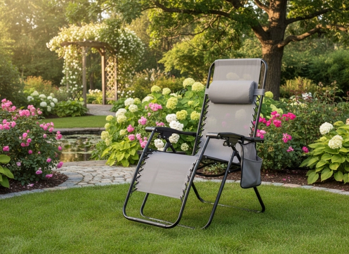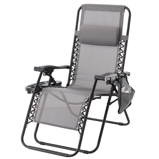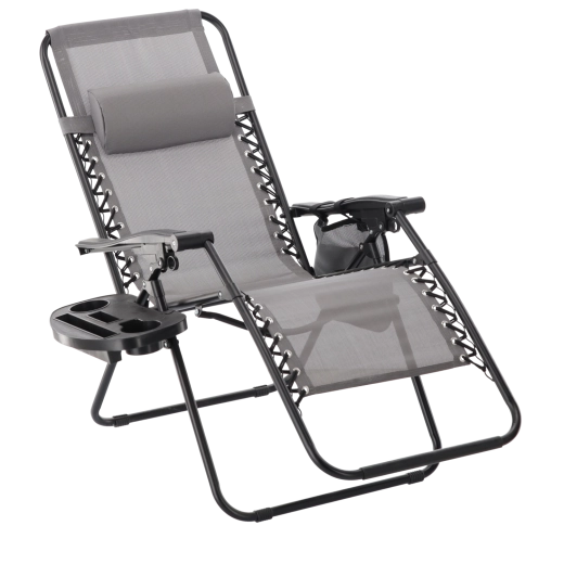 Zrelaksuj się na tarasie lub w ogrodzie z tym szarym leżakiem z funkcją niemal zerowej grawitacji. Oferuje regulowaną pozycję leżenia, odpinany zagłówek, praktyczny boczny stolik z uchwytem na napoje oraz kieszeń na drobiazgi. Oddychająca siatka Textilene zapewnia komfort nawet w upały, a solidna metalowa rama gwarantuje stabilność i trwałość do codziennego użytku na zewnątrz.