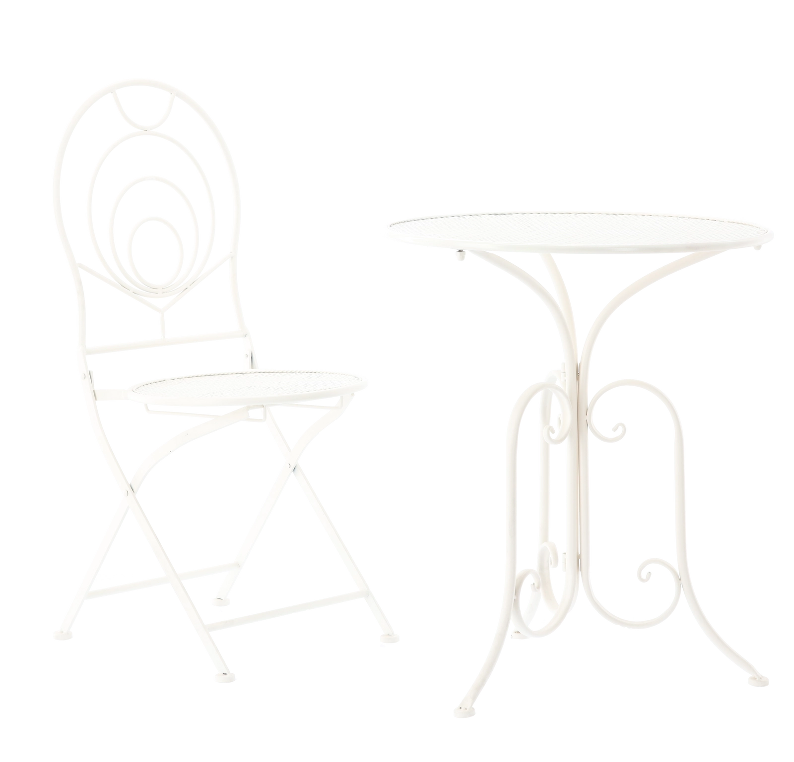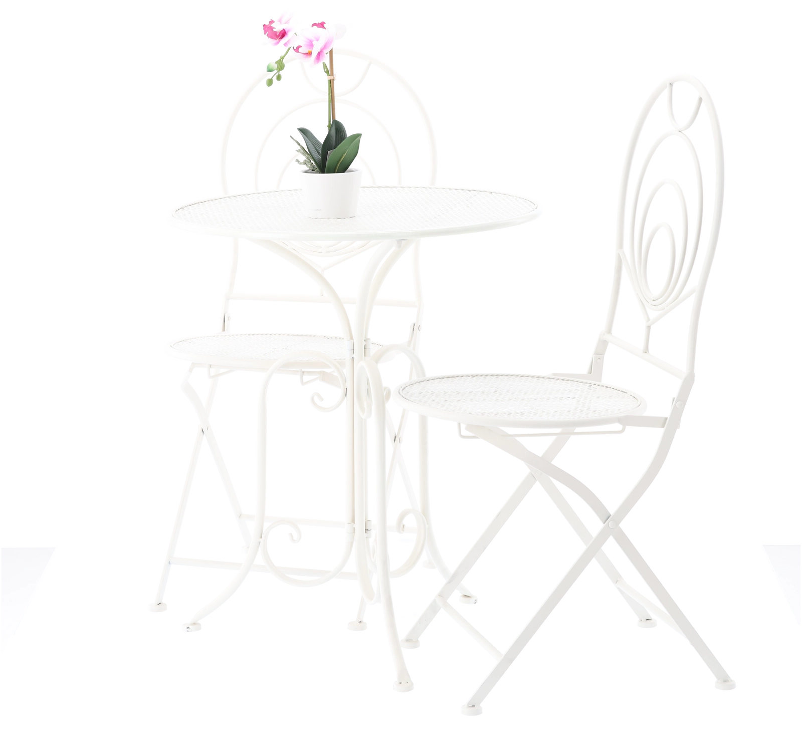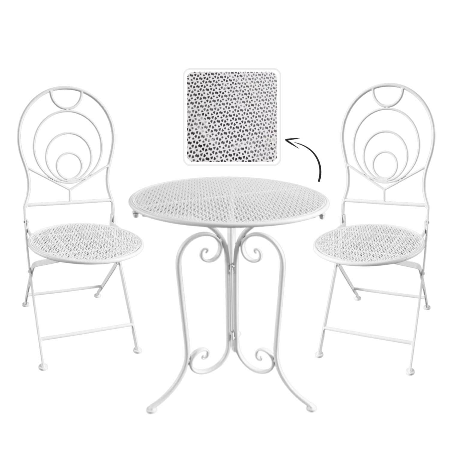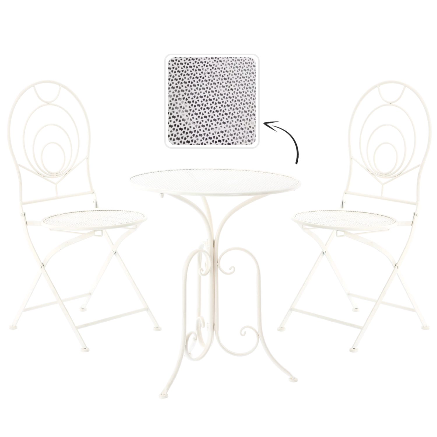 Krzesła są składane, więc po przerwie na kawę szybko schowasz zestaw nawet w mniejszej przestrzeni. Okrągły stół oferuje wygodną powierzchnię na napoje lub dekoracje. Dzięki uniwersalnej bieli i retro zdobieniom zestaw sprawdzi się w ogrodach, kawiarniach oraz we wnętrzach w stylu vintage.