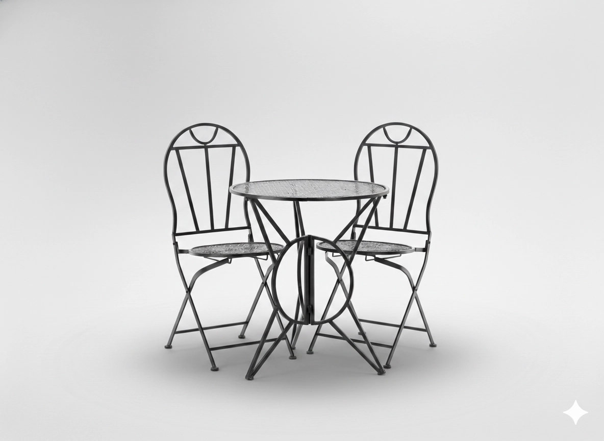 Kompaktowy 3‑częściowy zestaw SUSAN wyróżnia się dekoracyjnymi perforacjami i ponadczasowym, vintage’owym wyglądem. Metalowe wzmocnienia w kształcie X zapewniają stabilność, a składany mechanizm krzeseł i stołu umożliwia szybkie sprzątanie i oszczędność miejsca. Idealny na małe balkony, miejskie tarasy i ogrodowe zakątki.