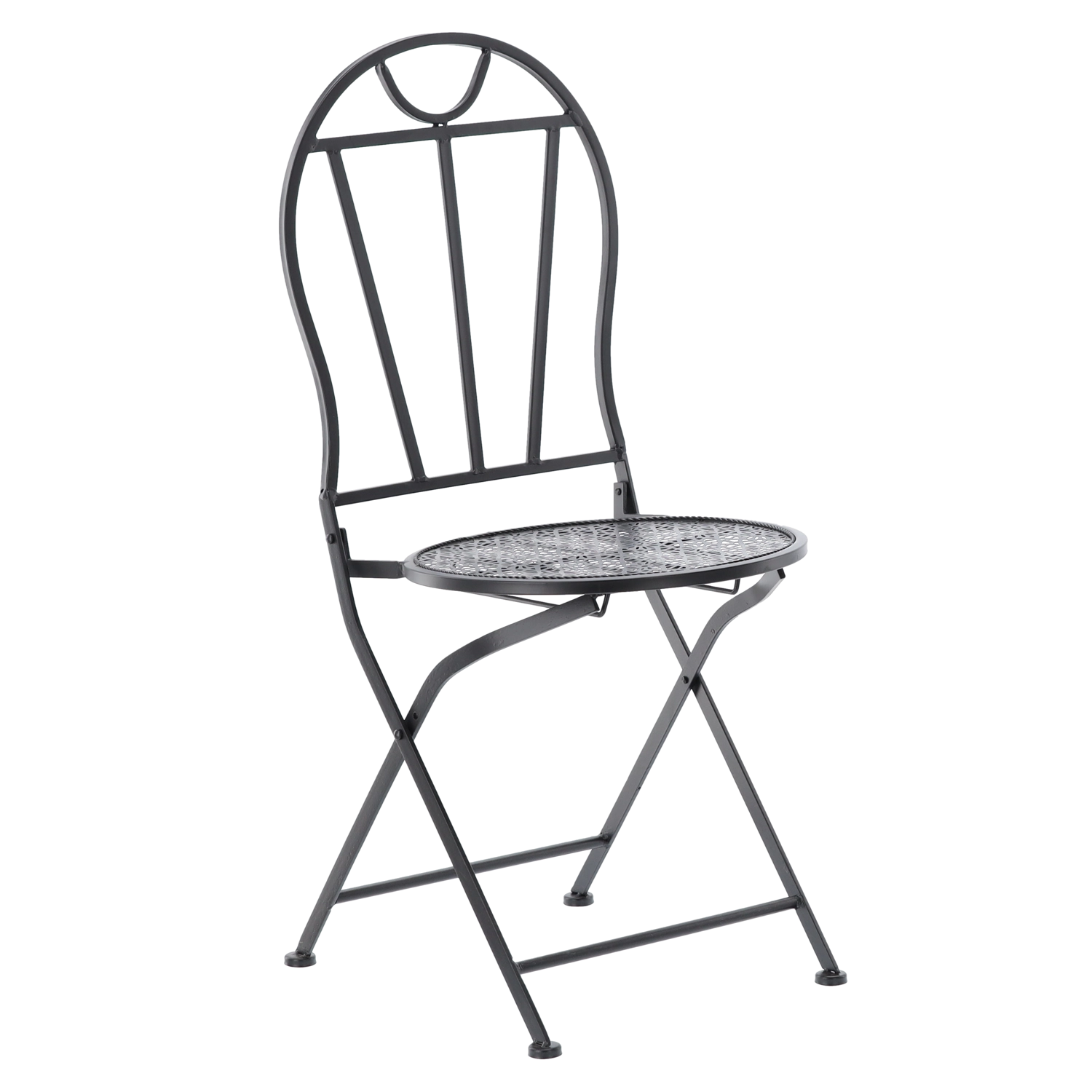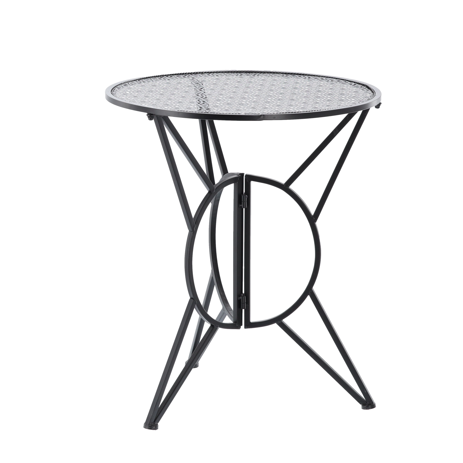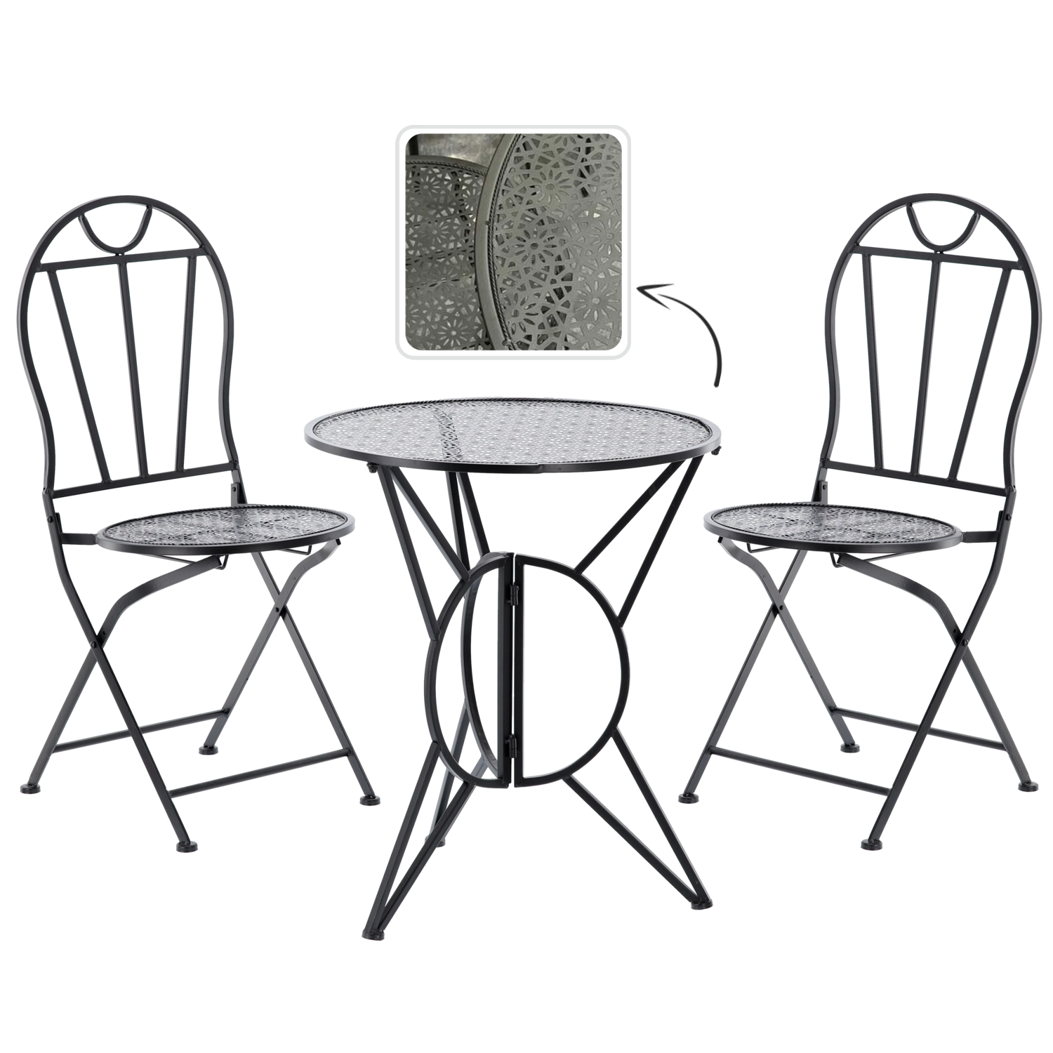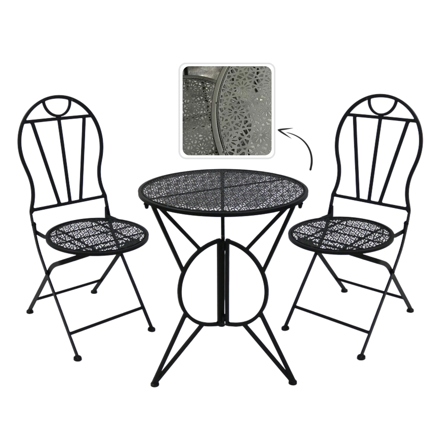 Elegancki metalowy zestaw bistro w stylu retro na balkon, taras i do ogrodu oferuje solidną i stabilną konstrukcję, składane krzesła dla łatwego przechowywania oraz stylowe perforowane wzory na blacie stołu i siedziskach. Wytrzymałe metalowe wykonanie z matową czarną powłoką świetnie sprawdza się na zewnątrz i gwarantuje wygodne miejsce na kawę i letnie kolacje.