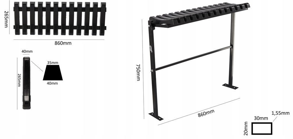 • Wytrzymała stalowa konstrukcja: siedzisko ze stalowych lameli, solidne nogi i wzmocnienia.