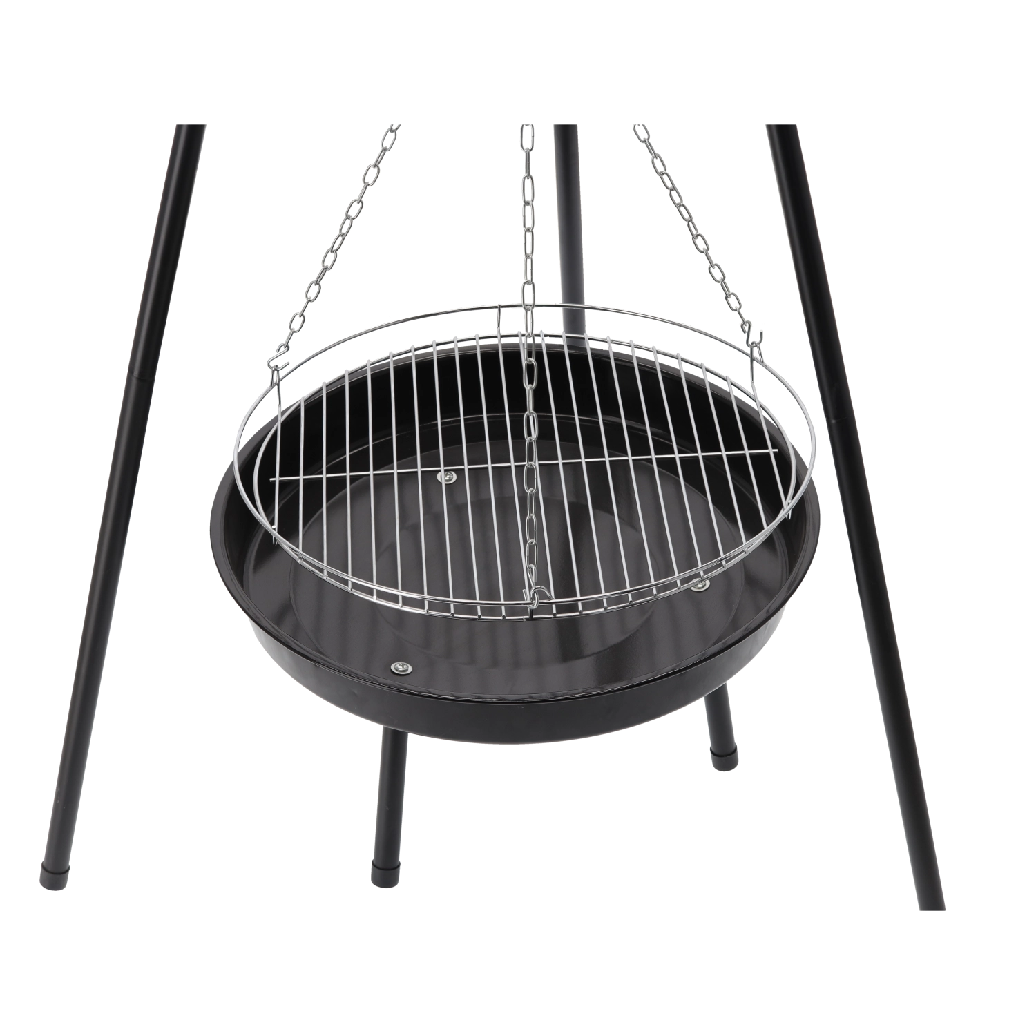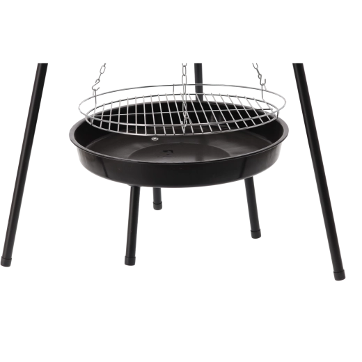 Ten zewnętrzny grill trójnogowy łączy swobodę gotowania nad rozżarzonymi węglami z praktycznymi detalami do codziennego użytku. Chromowany ruszt o średnicy 49,5 cm zawieszony na łańcuchach zapewnia równomierne nagrzewanie i łatwą regulację wysokości nad ogniem. Emaliowana misa paleniska o średnicy 50 cm jest trwała, łatwa w czyszczeniu i długo utrzymuje ciepło.