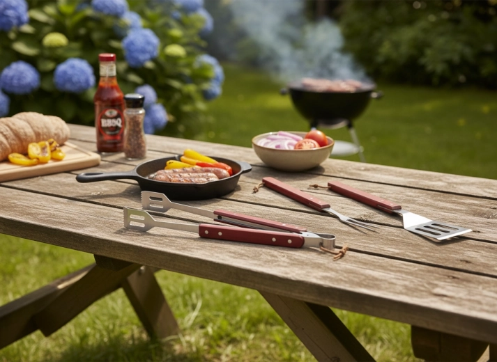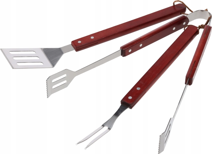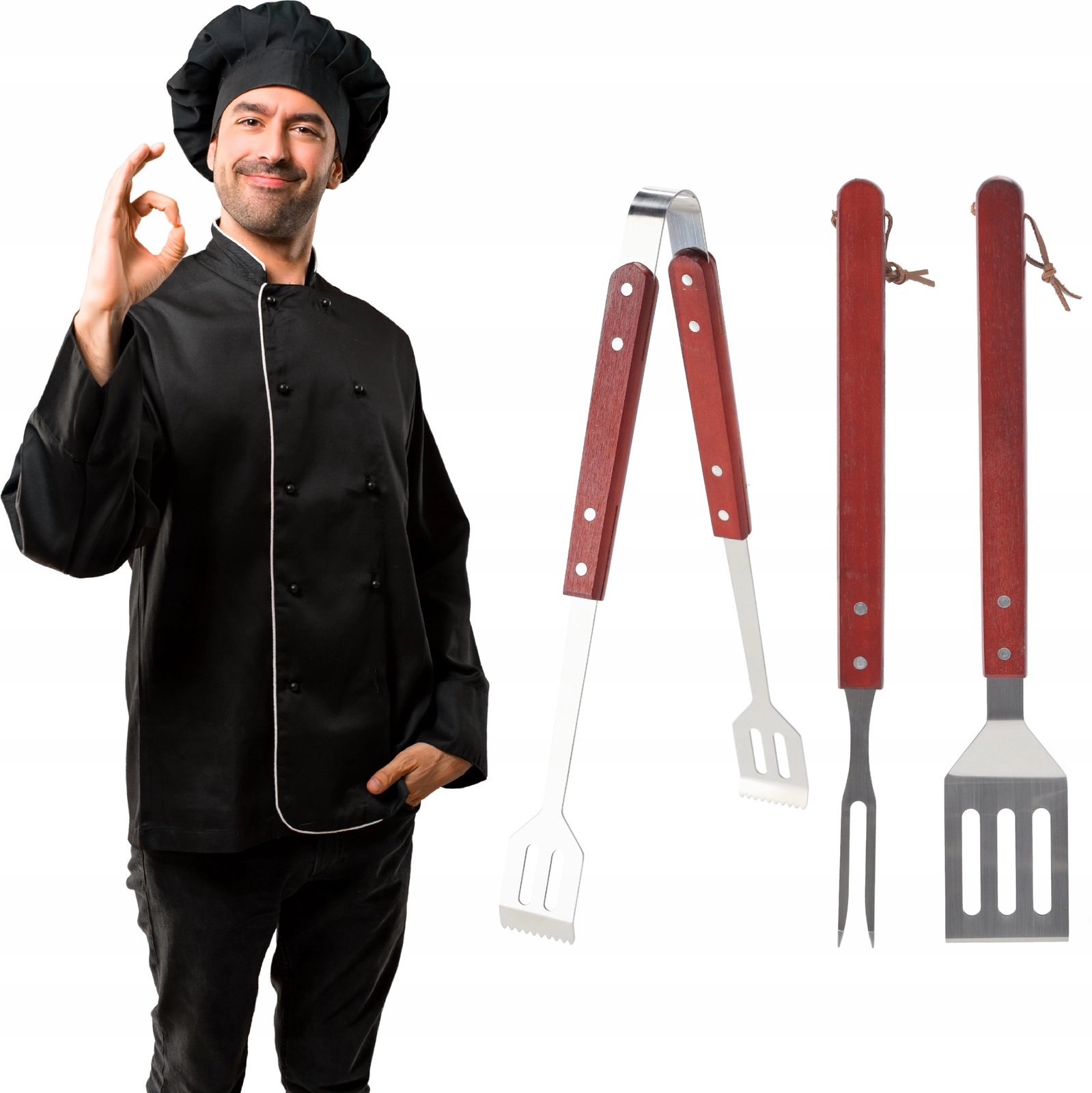 Praktyczny zestaw dla każdego miłośnika grilla: trzy niezbędne narzędzia ze stali nierdzewnej z ergonomicznymi, drewnianymi uchwytami. Łopatka do łatwego przewracania, szczypce do pewnego chwytu oraz widelec do nakłuwania i przytrzymywania mięsa – wszystko zaprojektowane z myślą o bezpiecznej i komfortowej pracy przy grillu.