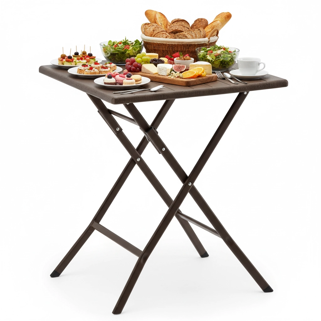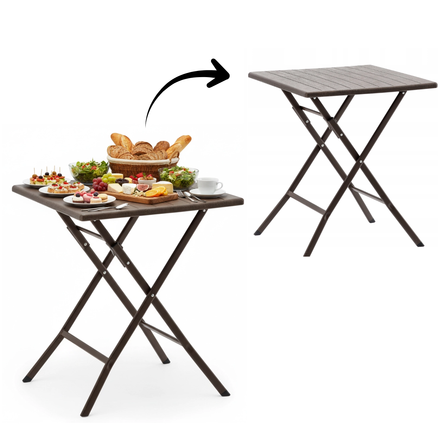 Praktyczny składany turystyczny stół o wymiarach 61,5 × 61,5 × 73 cm łączy lekką konstrukcję z wysoką stabilnością. Powierzchnia w brązowym odcieniu z dekorem drewna łatwo komponuje się z meblami ogrodowymi, a dzięki składanym nogom w kilka chwil schowasz go nawet w małych przestrzeniach.