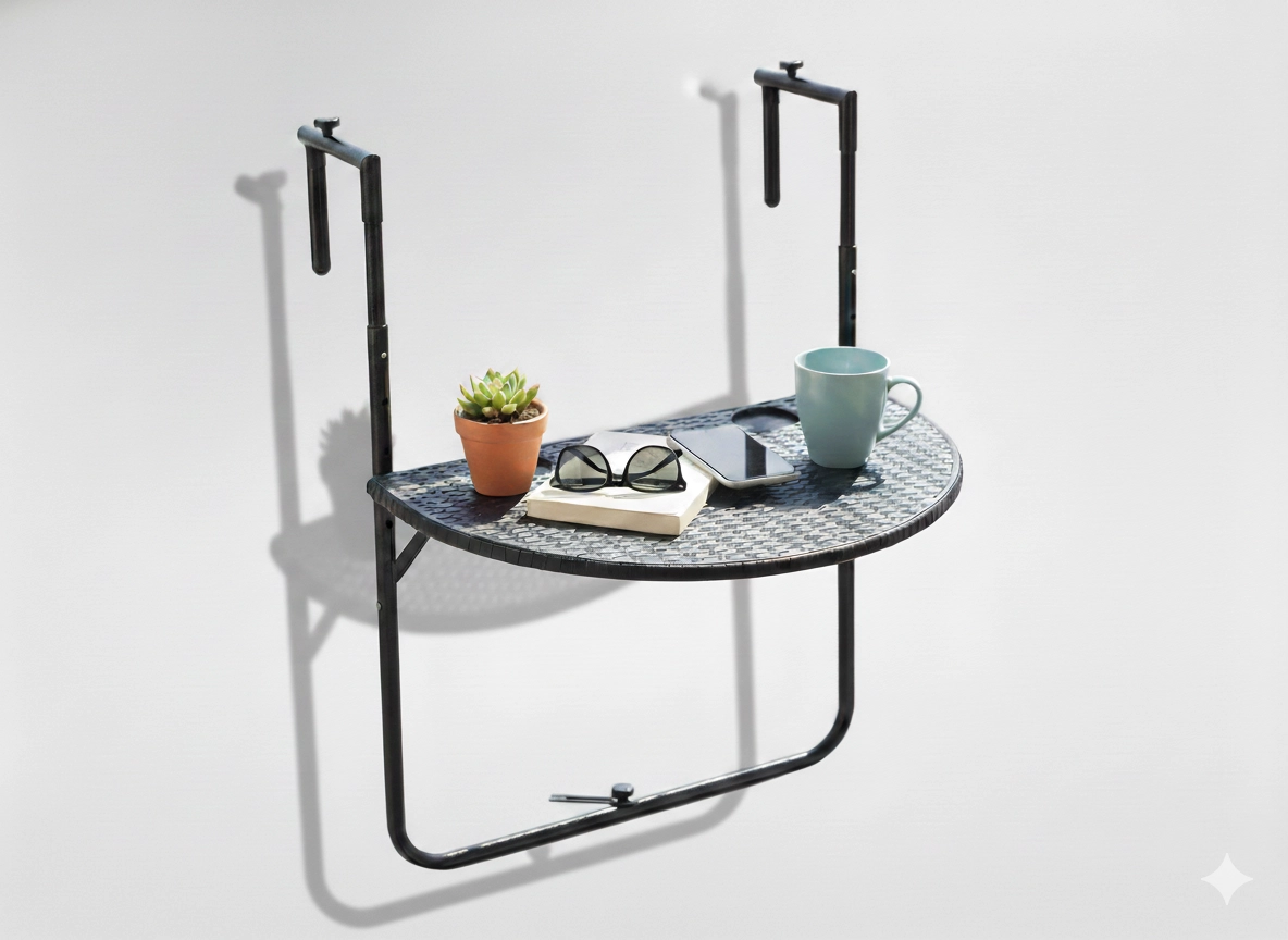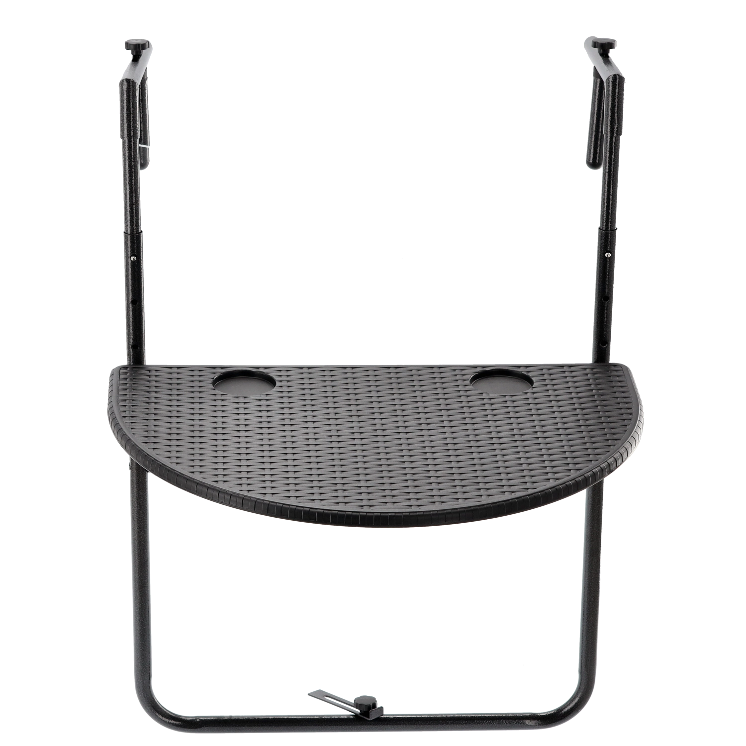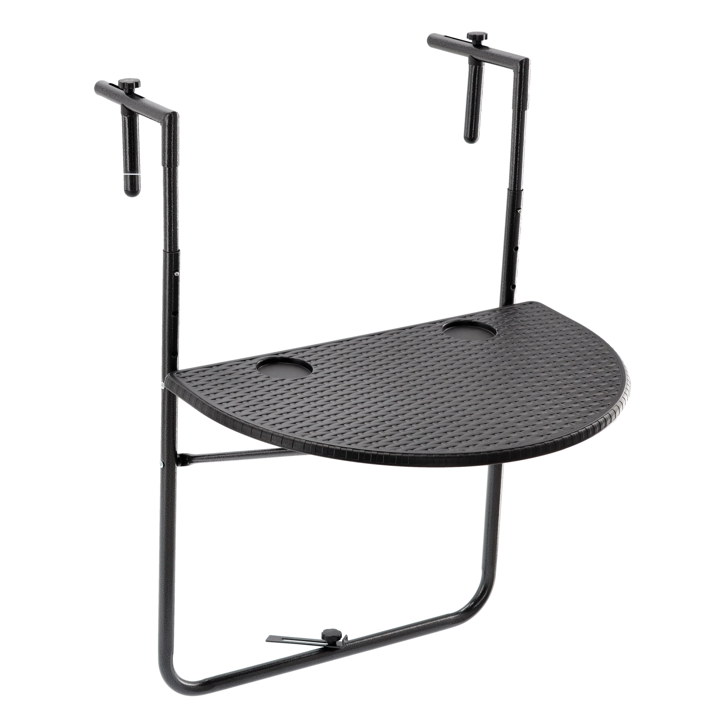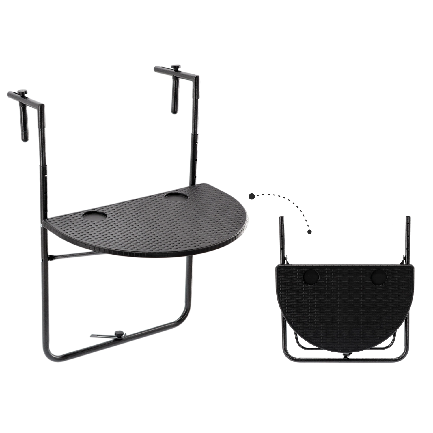 Praktyczny zawieszany stół balkonowy oszczędza miejsce i zamienia nawet mały balkon w przytulny kącik. Dzięki składanej konstrukcji, półokrągłemu kształtowi i regulowanej wysokości 73–78,5–83,5 cm zapewnia wygodę przy kawie, pracy i relaksie. Trwała metalowa konstrukcja oraz blat w czarnym, rattanowym wyglądzie prezentują się elegancko i są łatwe w utrzymaniu.