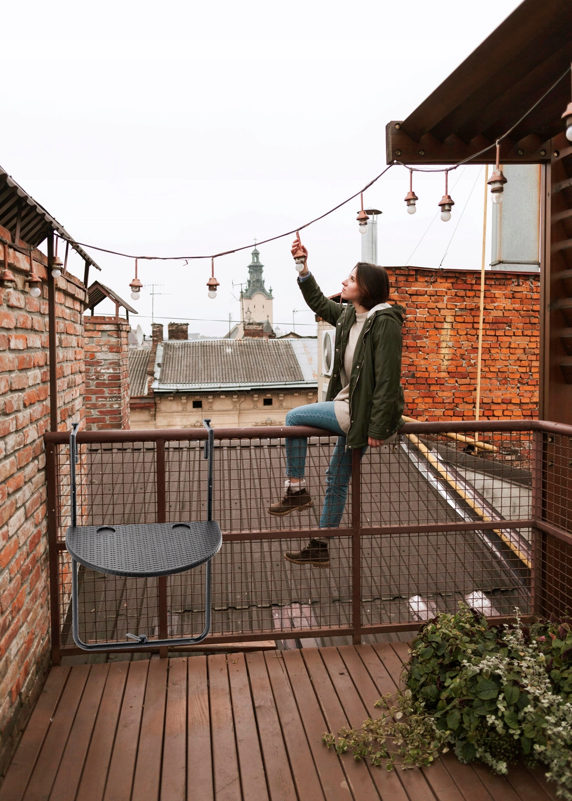 Stół zawiesisz na balustradzie balkonu za pomocą regulowanych uchwytów. Półokrągły kształt sprytnie oszczędza miejsce, a zintegrowane otwory na napoje stabilnie trzymają szklanki. Po użyciu stół jednym ruchem składasz w dół – idealne rozwiązanie na małe balkony.