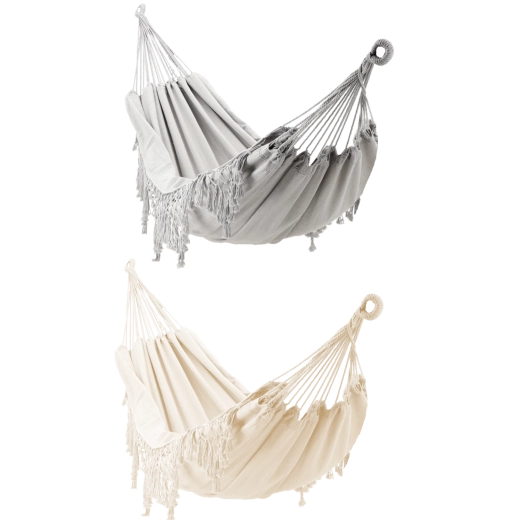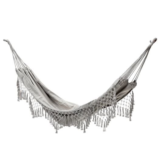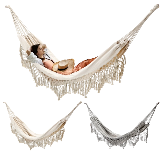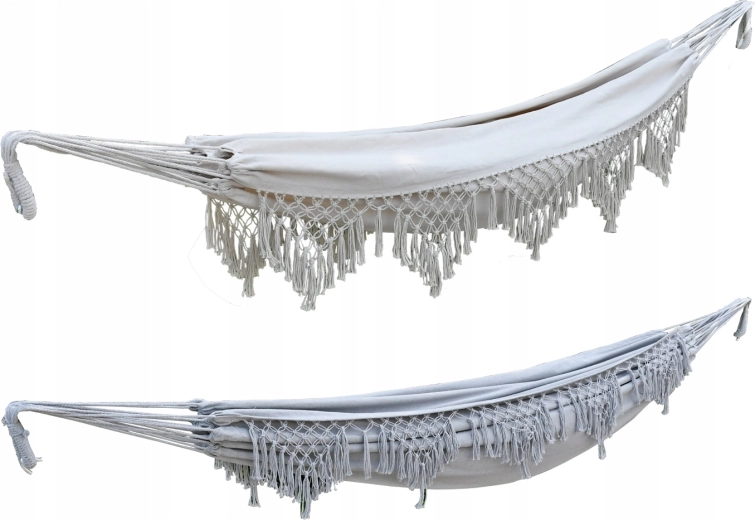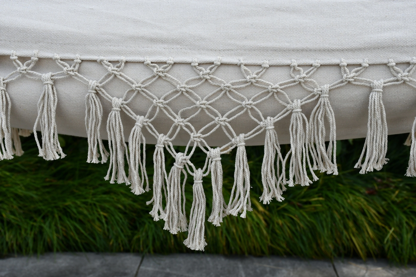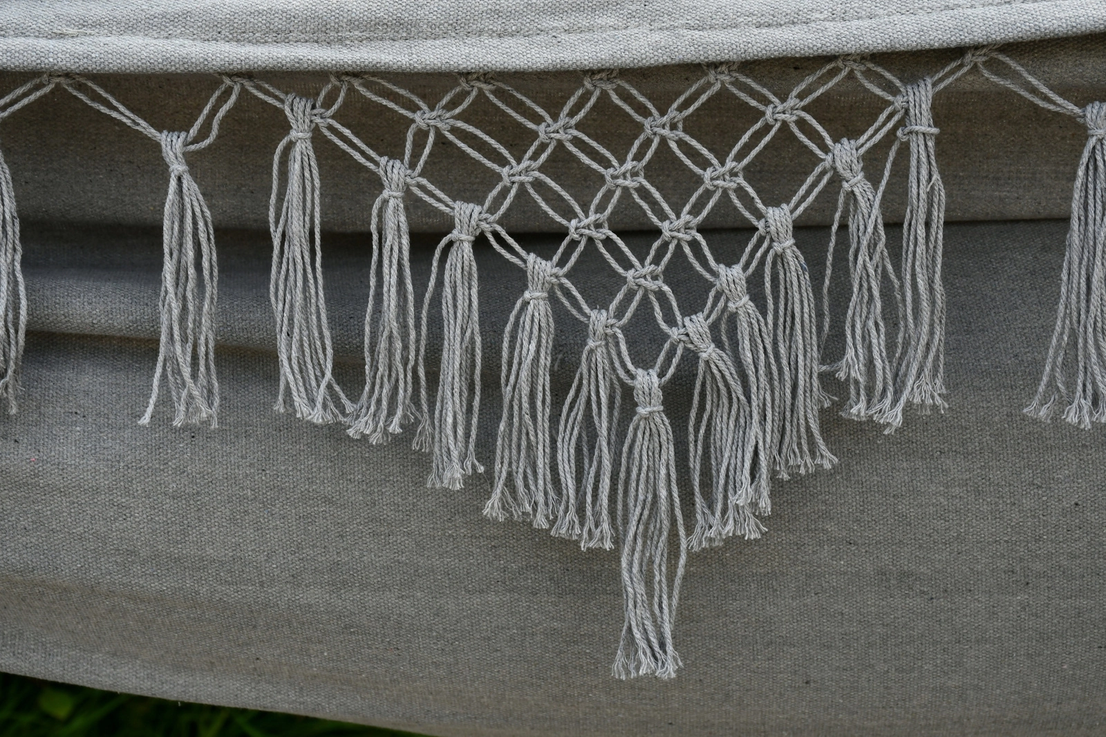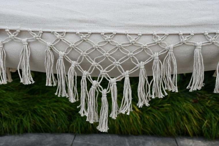 Eleganckie wykończenie makramowe nadaje hamakowi wyjątkowy charakter, który świetnie współgra z naturalnymi i nowoczesnymi aranżacjami na zewnątrz.