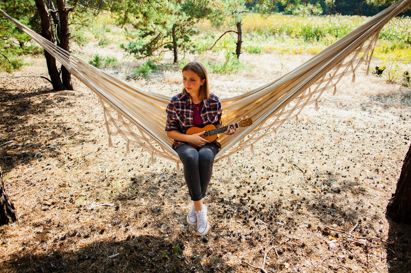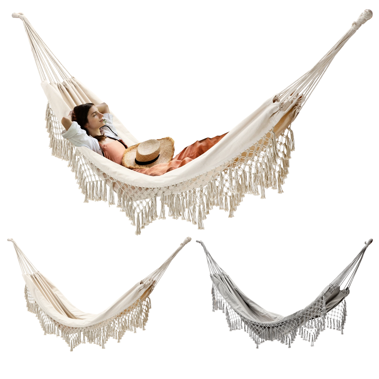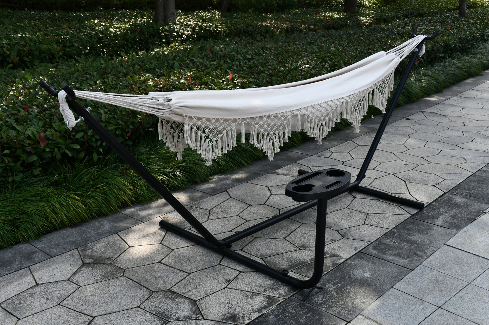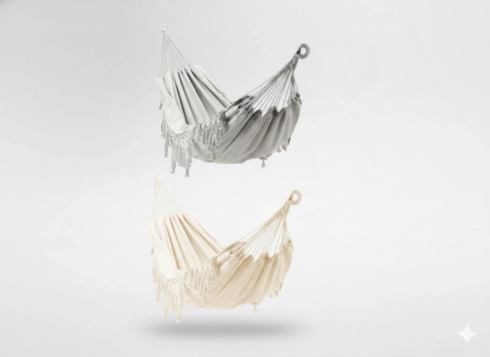 Eleganckie wykończenie makramowe nadaje hamakowi wyjątkowy charakter, który świetnie współgra z naturalnymi i nowoczesnymi aranżacjami na zewnątrz.