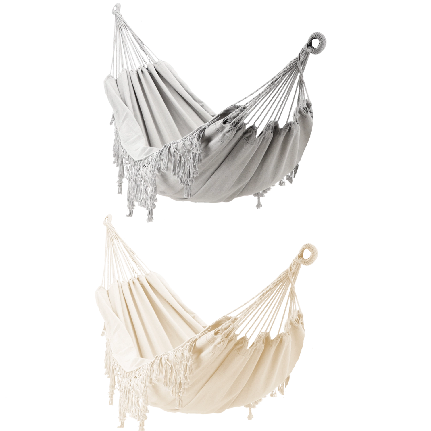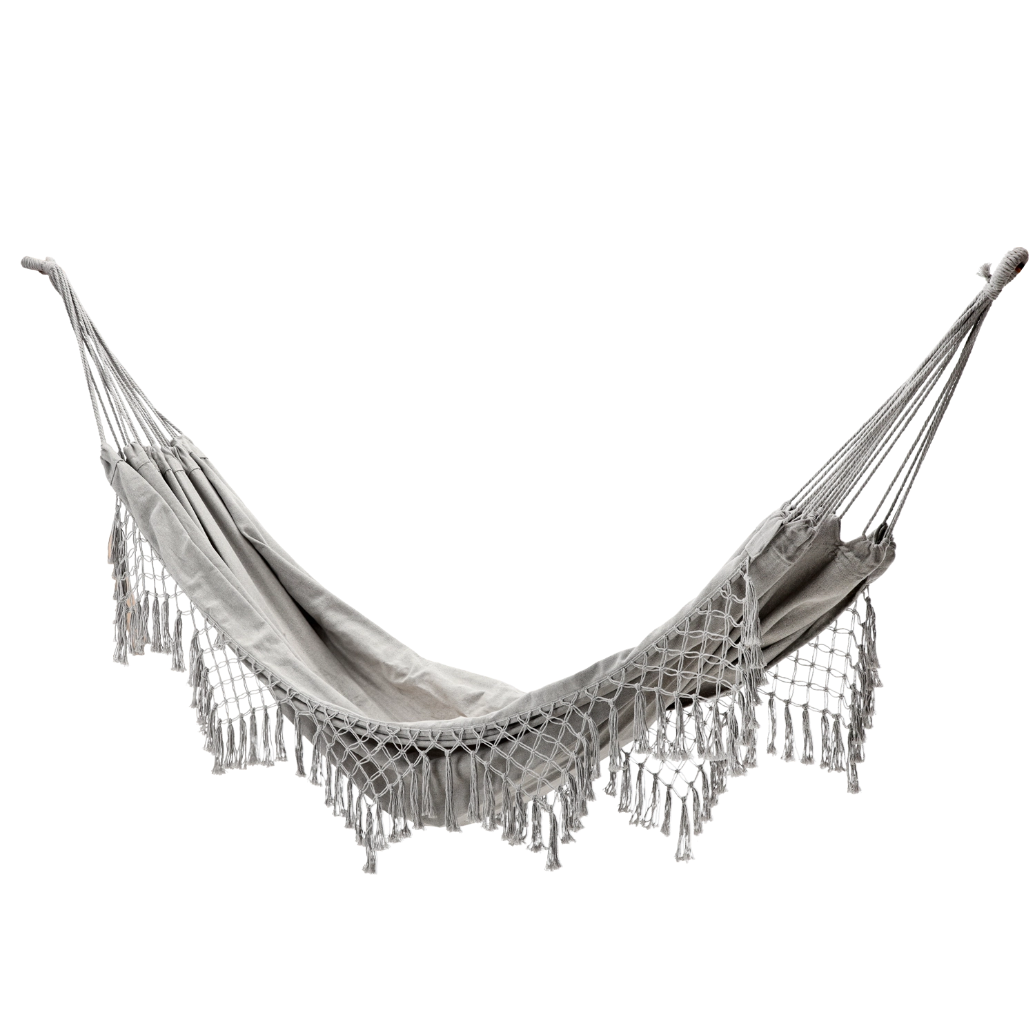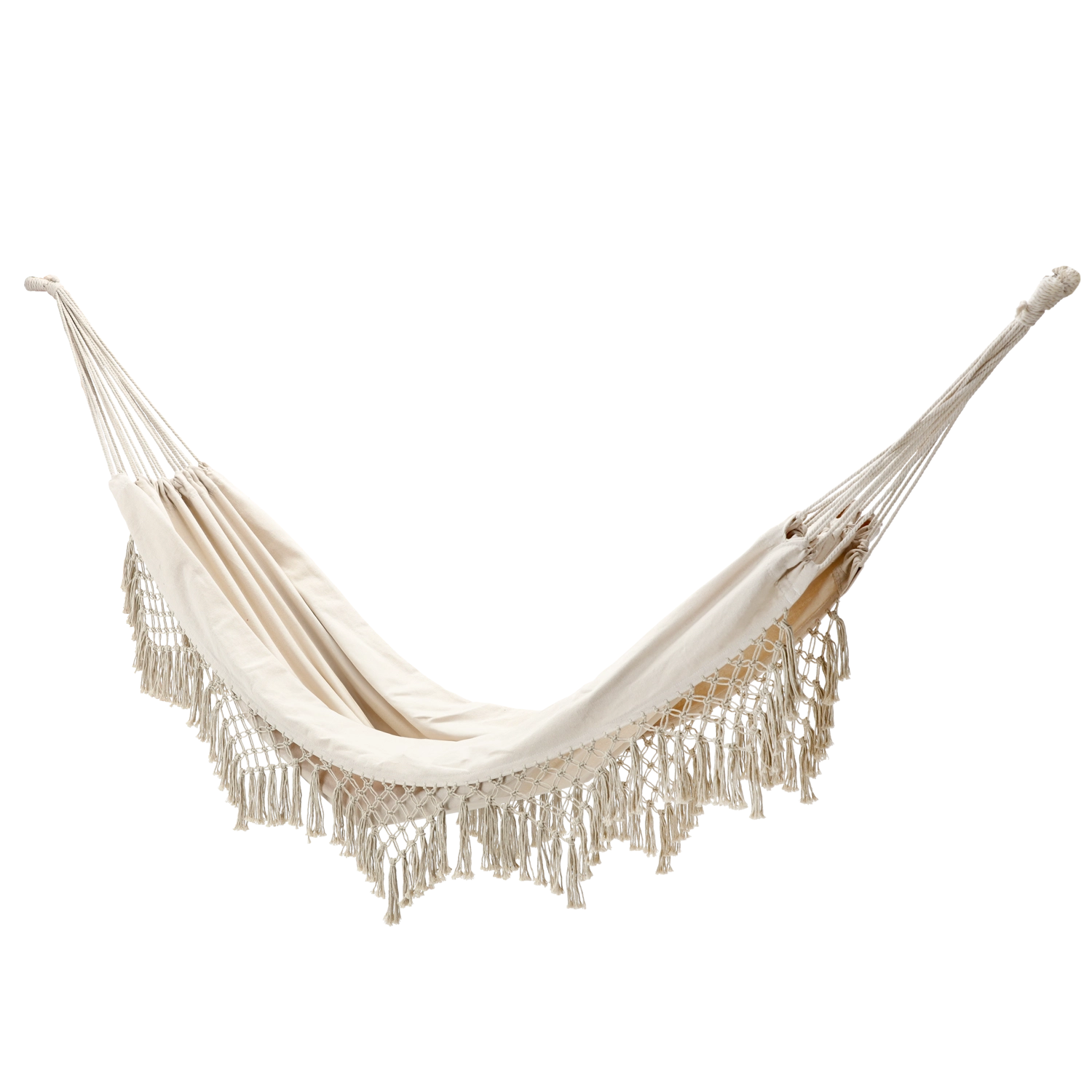 Ten stylowy hamak z frędzlami w designie boho wniesie do Twojej przestrzeni spokój i lekkość. Rozpięta tekstylna powierzchnia jest przyjemna w dotyku, a jednocześnie wystarczająco mocna do codziennego relaksu na zewnątrz i w domu.