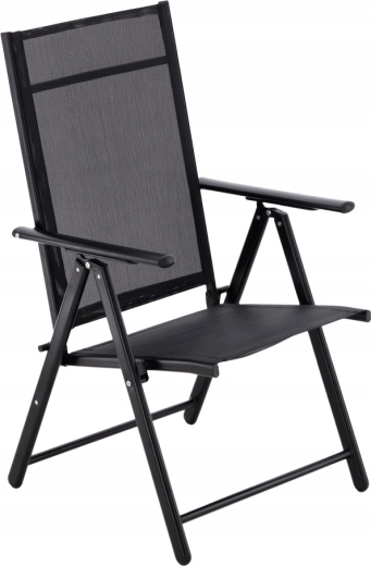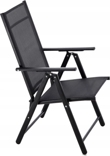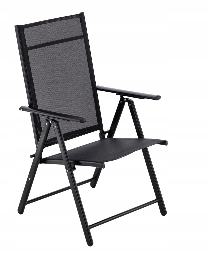To czarne, składane krzesło łączy nowoczesny wygląd z praktycznością do codziennego użytku w ogrodzie, na tarasie i balkonie. Stabilna stalowa konstrukcja z powłoką proszkową jest odporna na warunki atmosferyczne, a tekstylna siateczka jest przyjemna, szybko schnąca i łatwa w utrzymaniu.