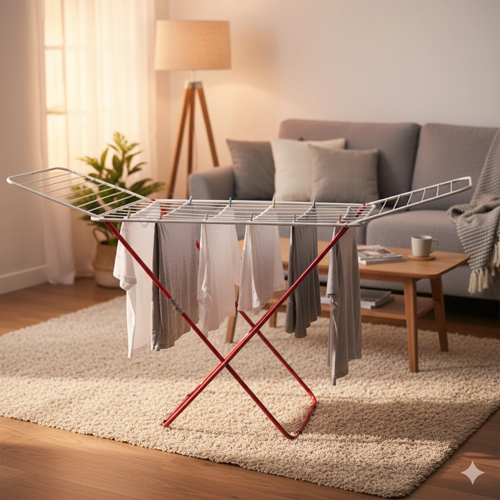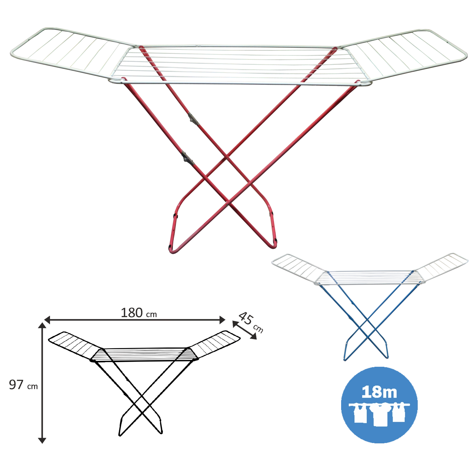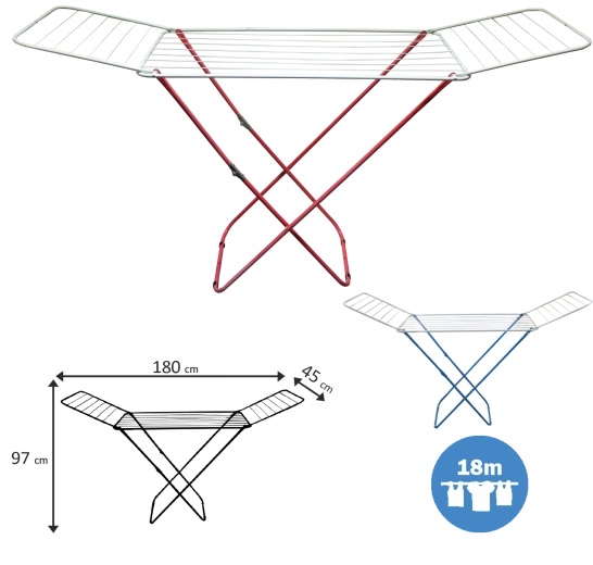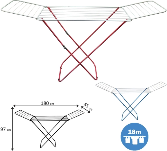 Składane skrzydła zwiększają przestrzeń do wieszania, a 18 metrów długości suszenia z powodzeniem wystarczy na tygodniową porcję prania. Stabilna konstrukcja X oraz solidne pręty utrzymają ręczniki, pościel i delikatne tkaniny.