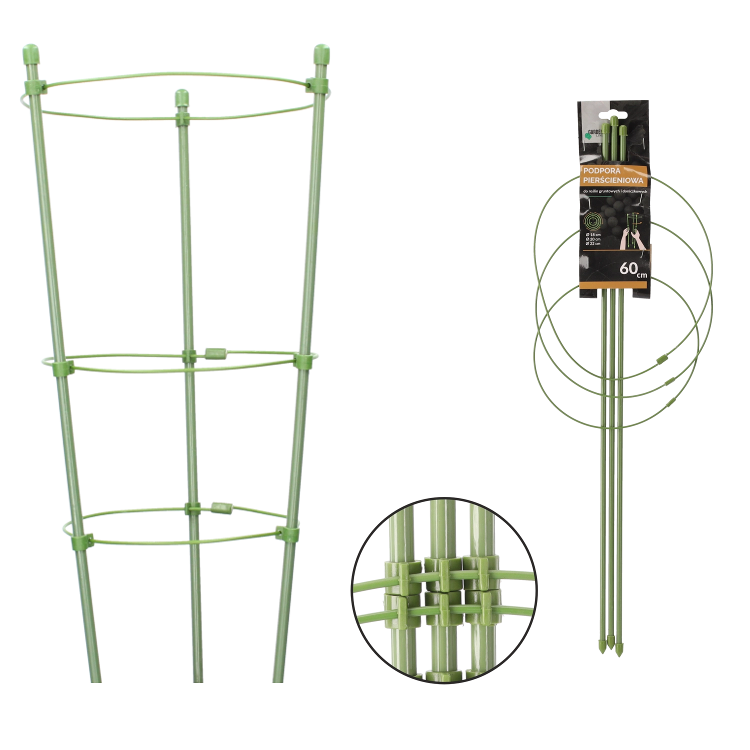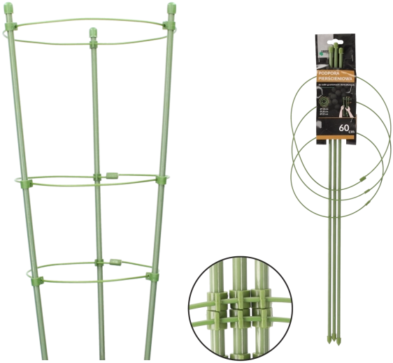 Ta okrągła podpora jest idealna do uprawy na rabatach i w donicach. Konstrukcja ze stali z powłoką polietylenową jest wysoce odporna na warunki atmosferyczne i uszkodzenia mechaniczne, a zielone wykończenie jest w roślinności niemal niewidoczne. Zapobiega pokładaniu się roślin na ziemię i wspiera ich harmonijny, wyprostowany wzrost.