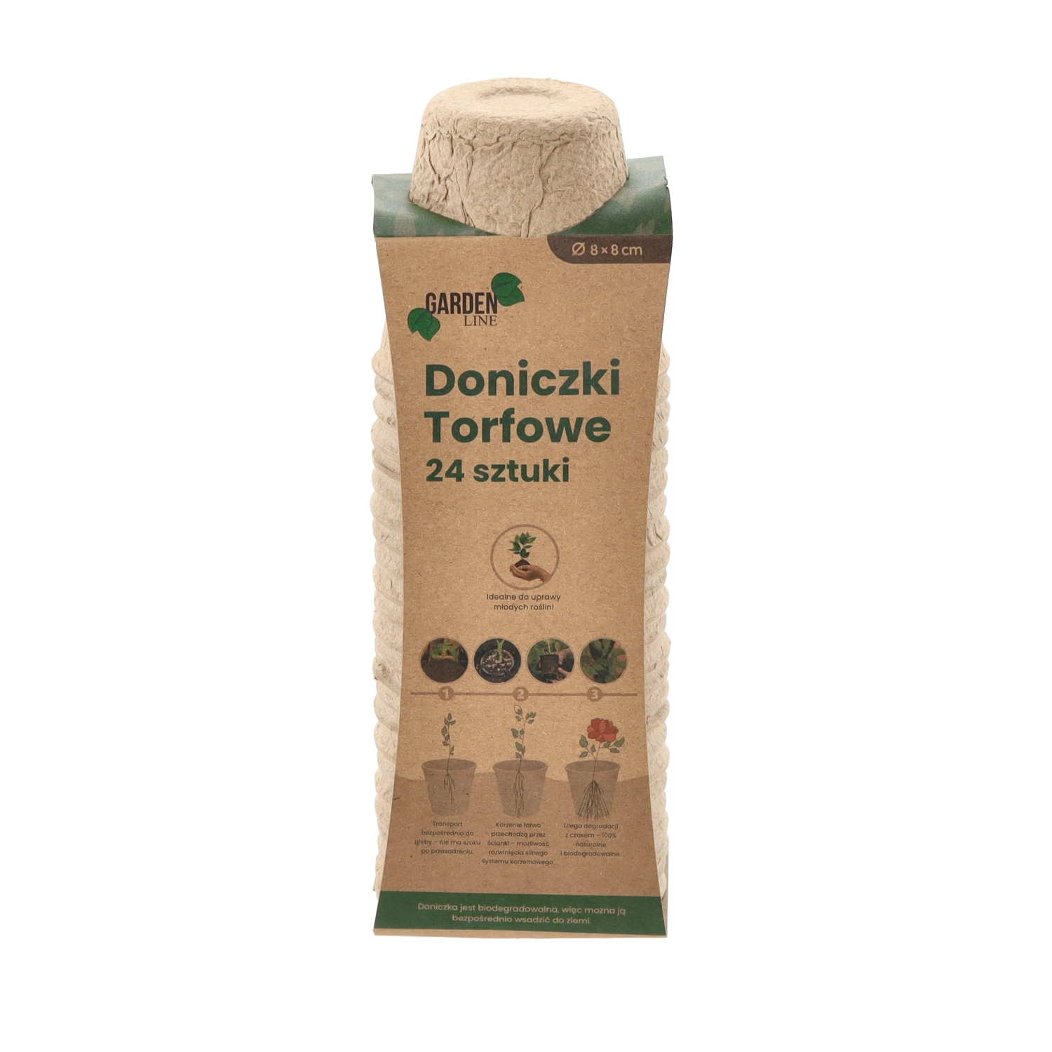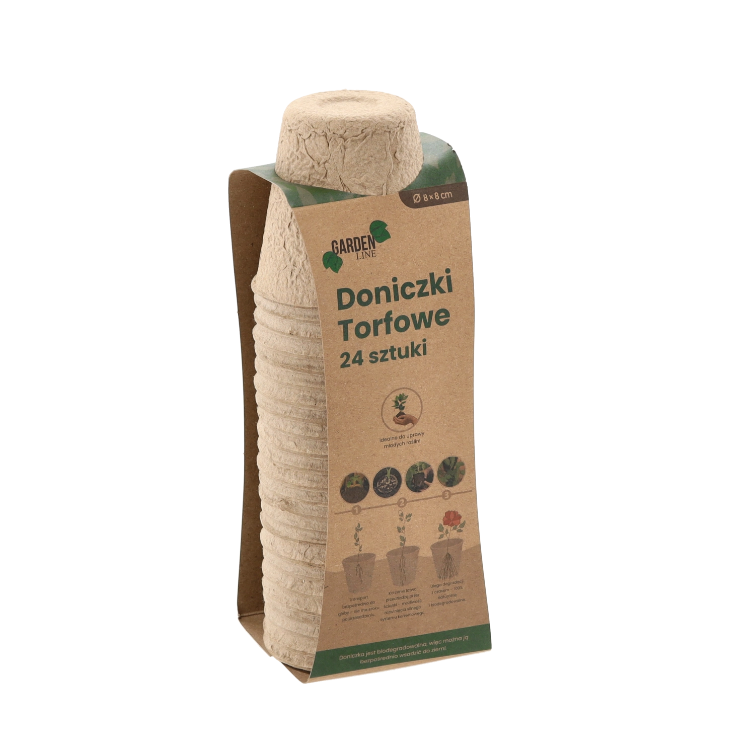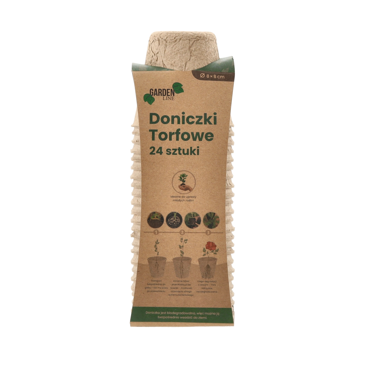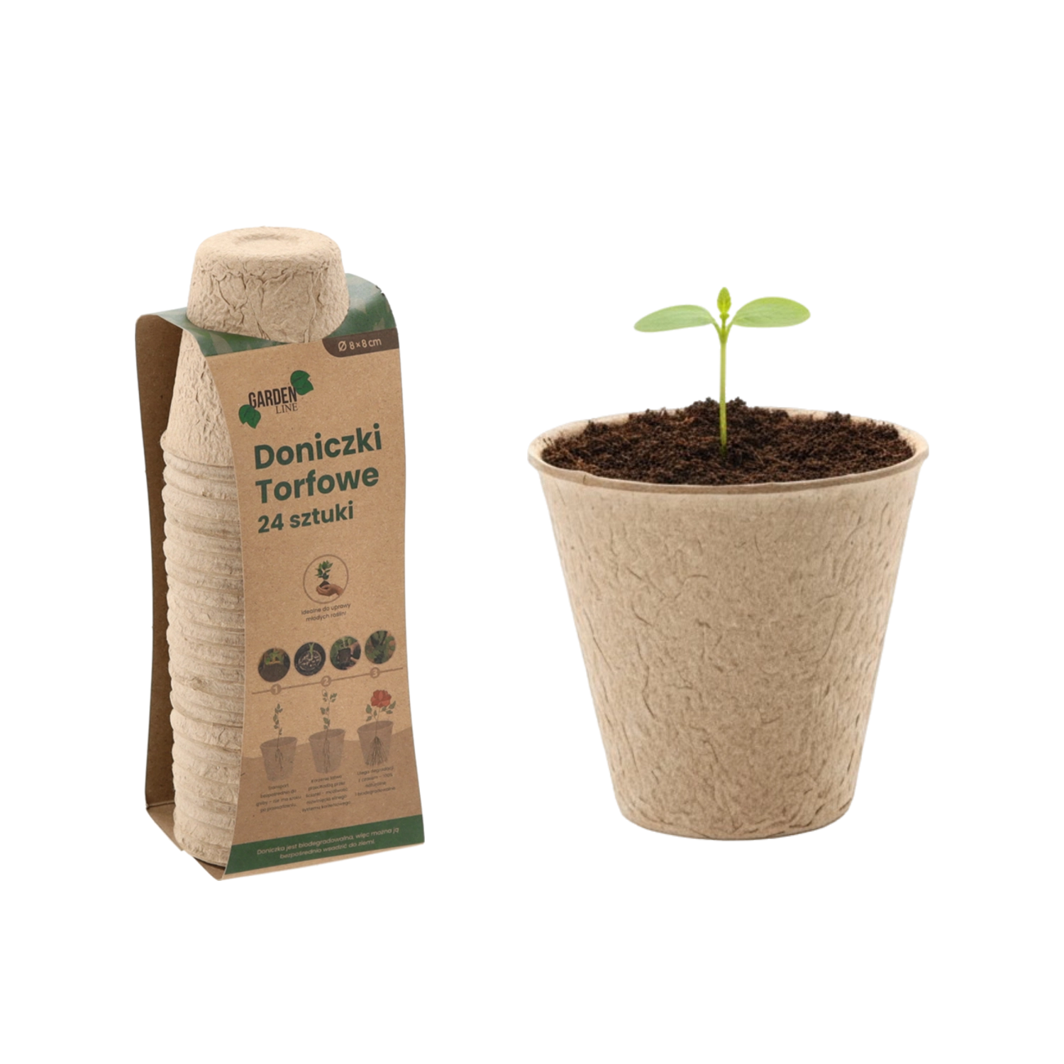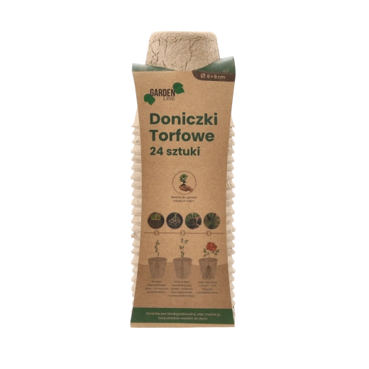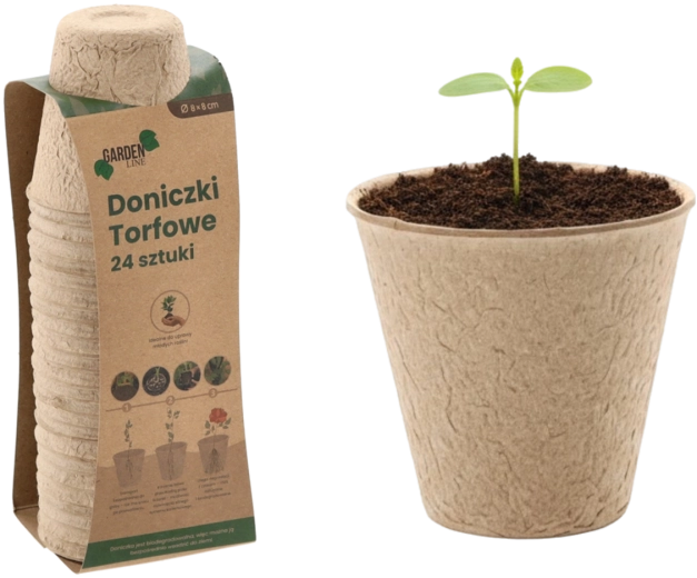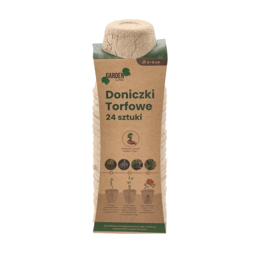 Ekologiczny zestaw 24 torfowych doniczek o wymiarach 8 × 8 cm do rozsady warzyw i kwiatów. Doniczki są w 100% biodegradowalne i można je sadzić bezpośrednio do gleby bez uszkadzania korzeni. Idealne na parapet, do szklarni i tunelu foliowego – dla zdrowych wschodów, łatwego przesadzania i zrównoważonej pielęgnacji roślin.