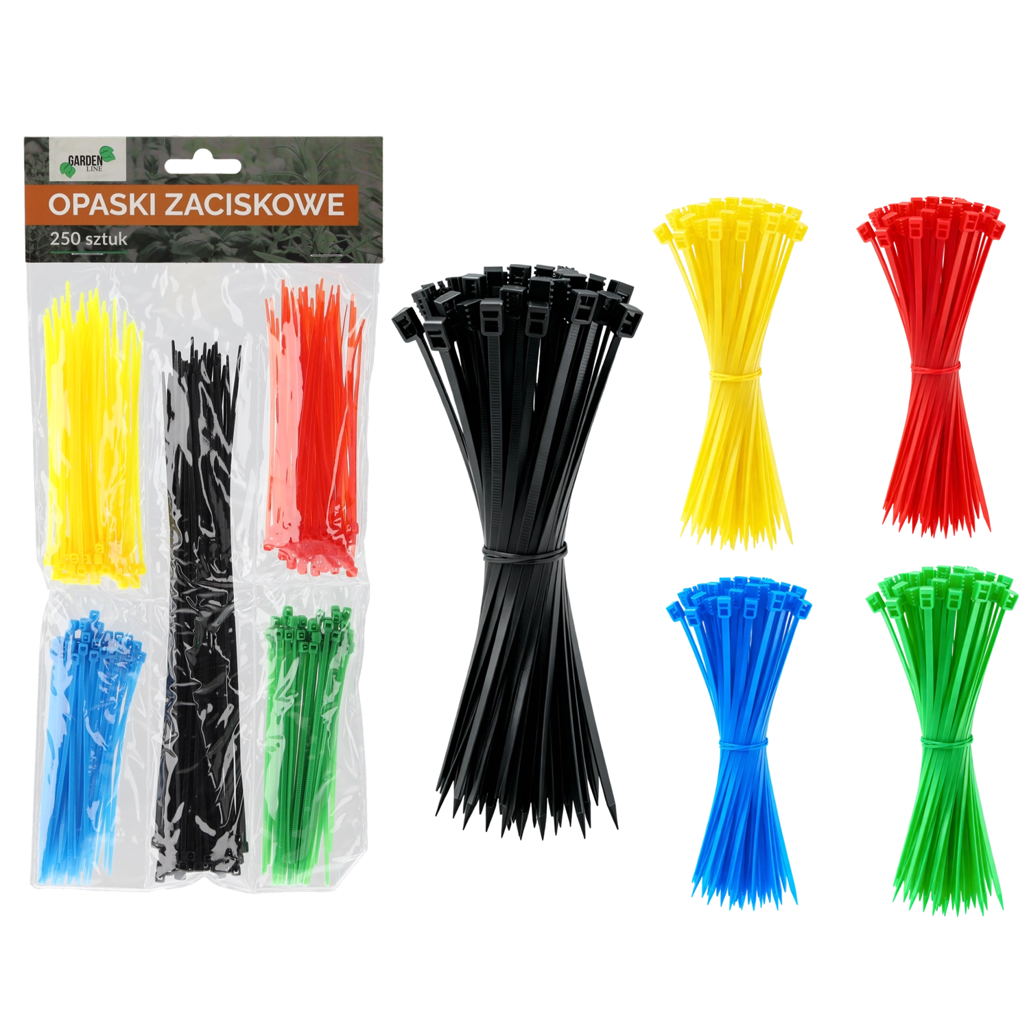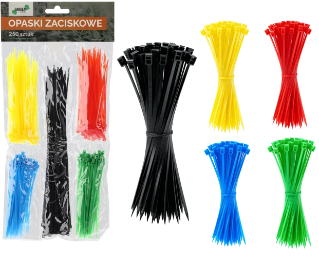 Praktyczny zestaw zawiera 250 jednorazowych opasek zaciskowych do wiązywania i mocowania roślin do palików lub podpór. Opaski są wielokolorowe i dekoracyjne, odpowiednie do użytku wewnątrz i na zewnątrz w szerokim zakresie temperatur.
