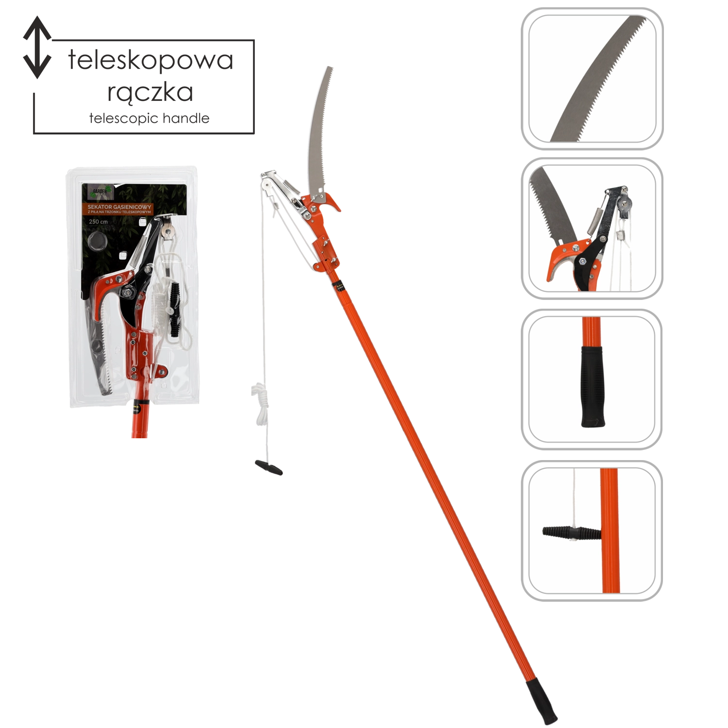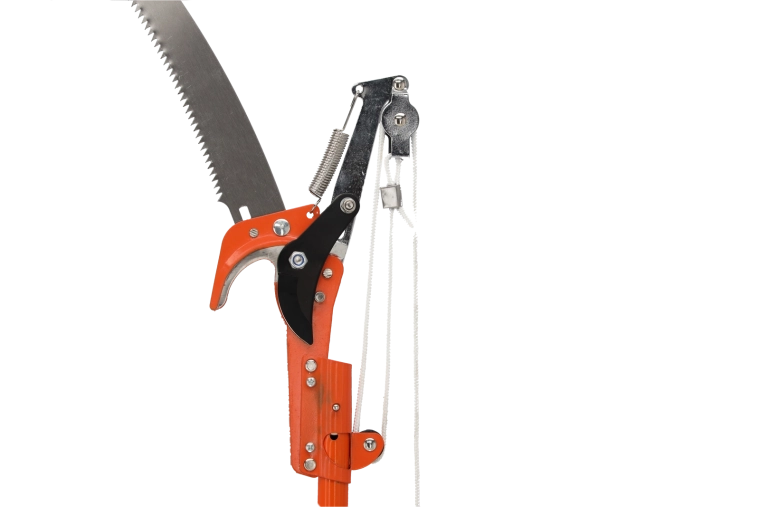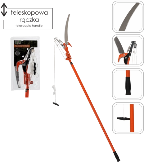 Teleskopowy trzonek pozwala przycinać wysokie gałęzie prosto z ziemi – bezpieczniej, szybciej i z lepszą kontrolą cięcia.