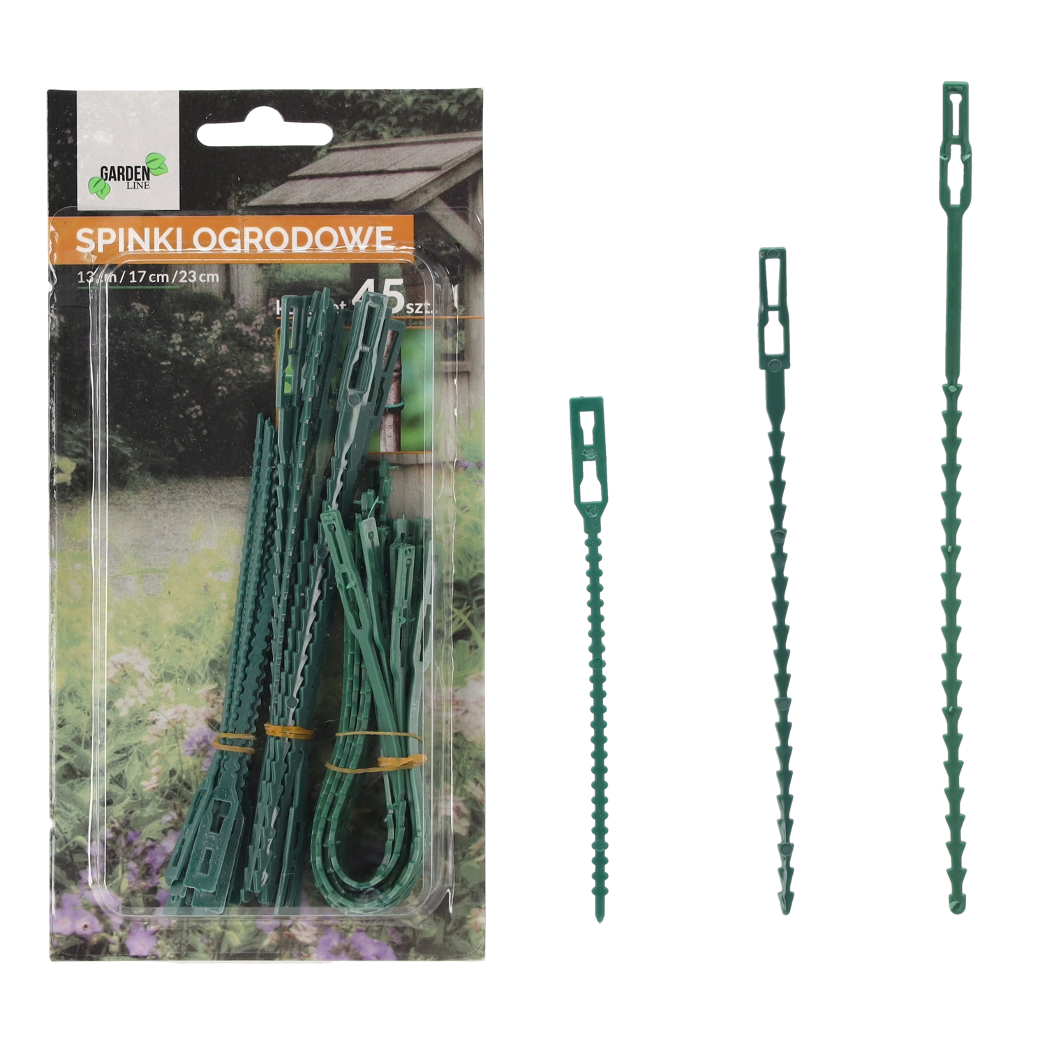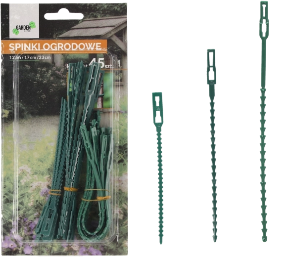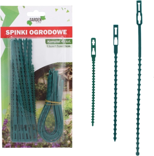 Praktyczny zestaw 45 ogrodowych klipsów o długościach 13, 17 i 23 cm do niezawodnego mocowania roślin do podpór bez uszkadzania łodyg. Trwały i elastyczny plastik umożliwia wielokrotne użycie, a zielony kolor dyskretnie wtapia się w rabaty, szklarnię i balkon.