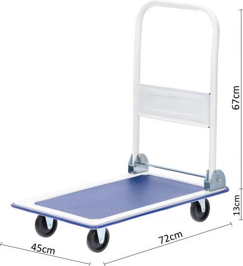 Praktyczny wózek platformowy o udźwigu 150 kg i kompaktowych wymiarach 72 × 45 × 80 cm ułatwia transport paczek, pudeł oraz materiałów w domu, biurze i magazynie. Dzięki składanej rączce i 4 obrotowym kółkom łatwo nim manewrować, a po pracy zajmuje minimum miejsca. Wytrzymała konstrukcja i antypoślizgowa powierzchnia zapewniają bezpieczną i stabilną pracę.