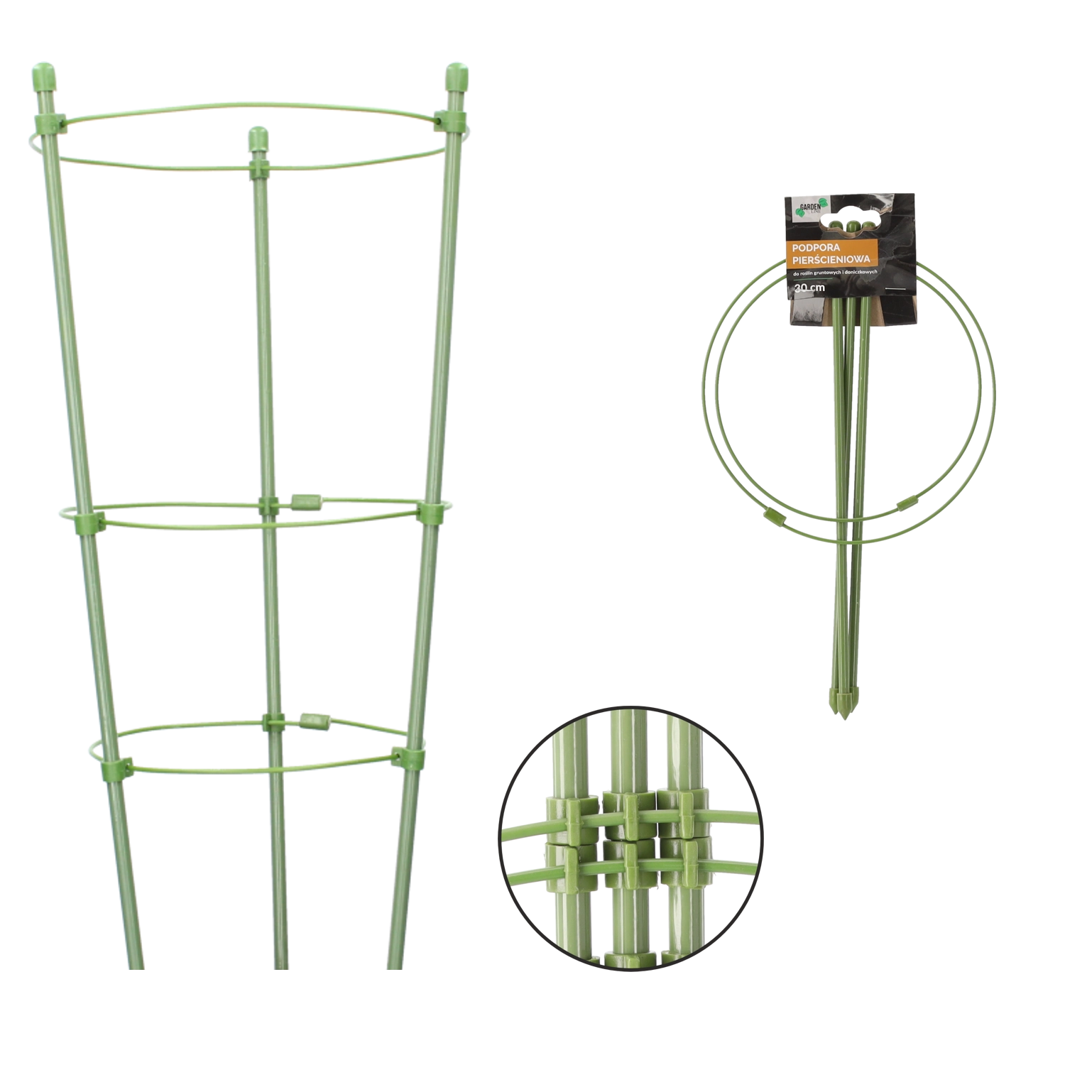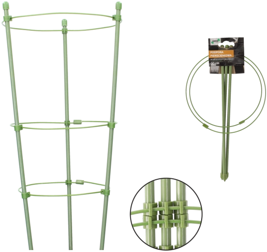 Praktyczna okrągła podpora do roślin z dwoma pierścieniami z wytrzymałej stali powlekanej polietylenem zapewnia stabilny wzrost, ochronę przed złamaniem oraz niewidoczne wkomponowanie w zieleń dzięki zielonemu kolorowi. Idealna do donic i rabat, świetnie sprawdza się przy uprawie borówek i hortensji.