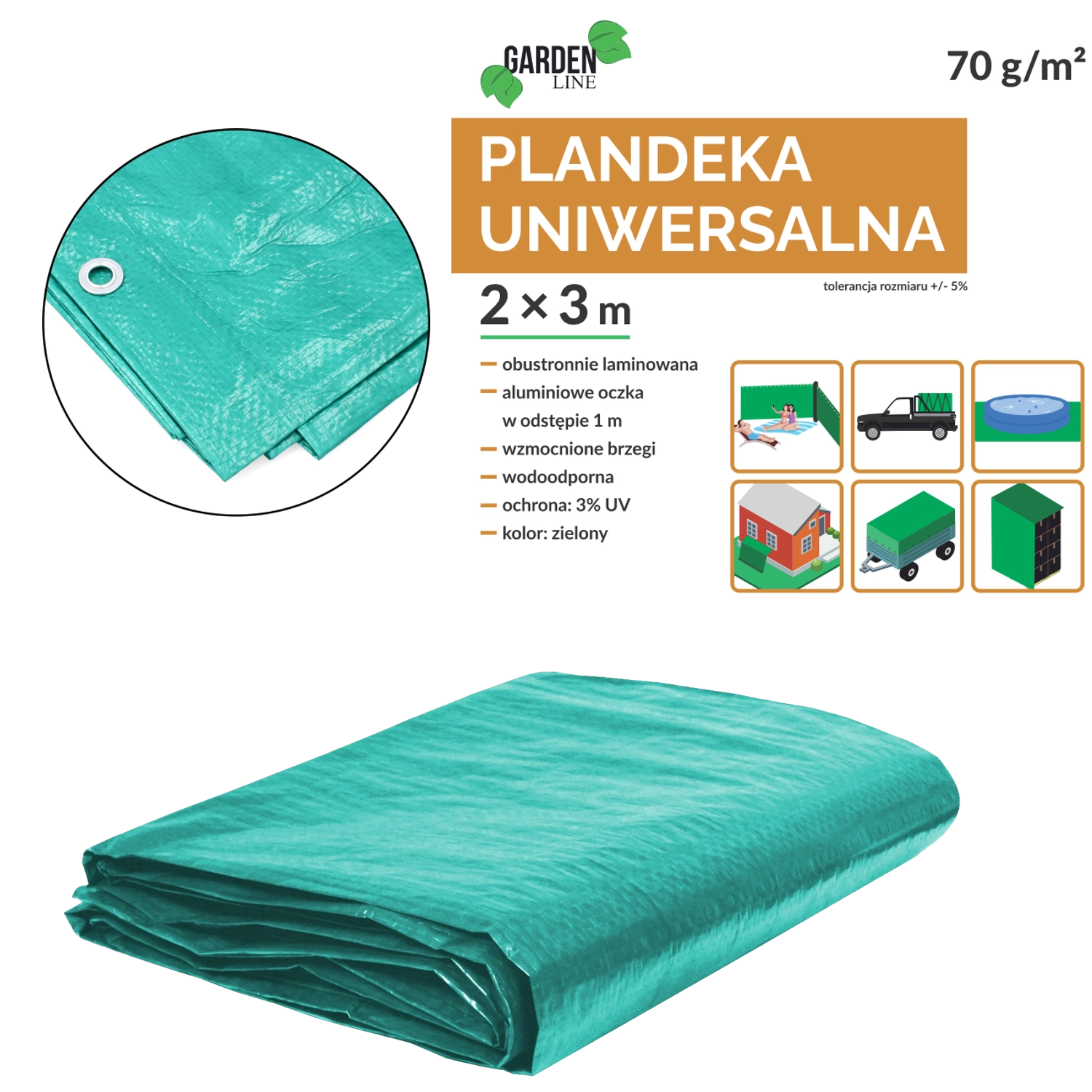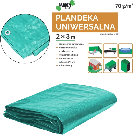 Uniwersalna zielona plandeka o wymiarach 2 × 3 m chroni przed warunkami atmosferycznymi, kurzem i wilgocią. Jest lekka (70 g/m²), obustronnie laminowana, posiada ochronę UV 3%, metalowe oczka do mocowania oraz wzmocnione krawędzie ze sznurkiem dla dłuższej żywotności.