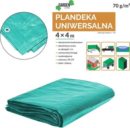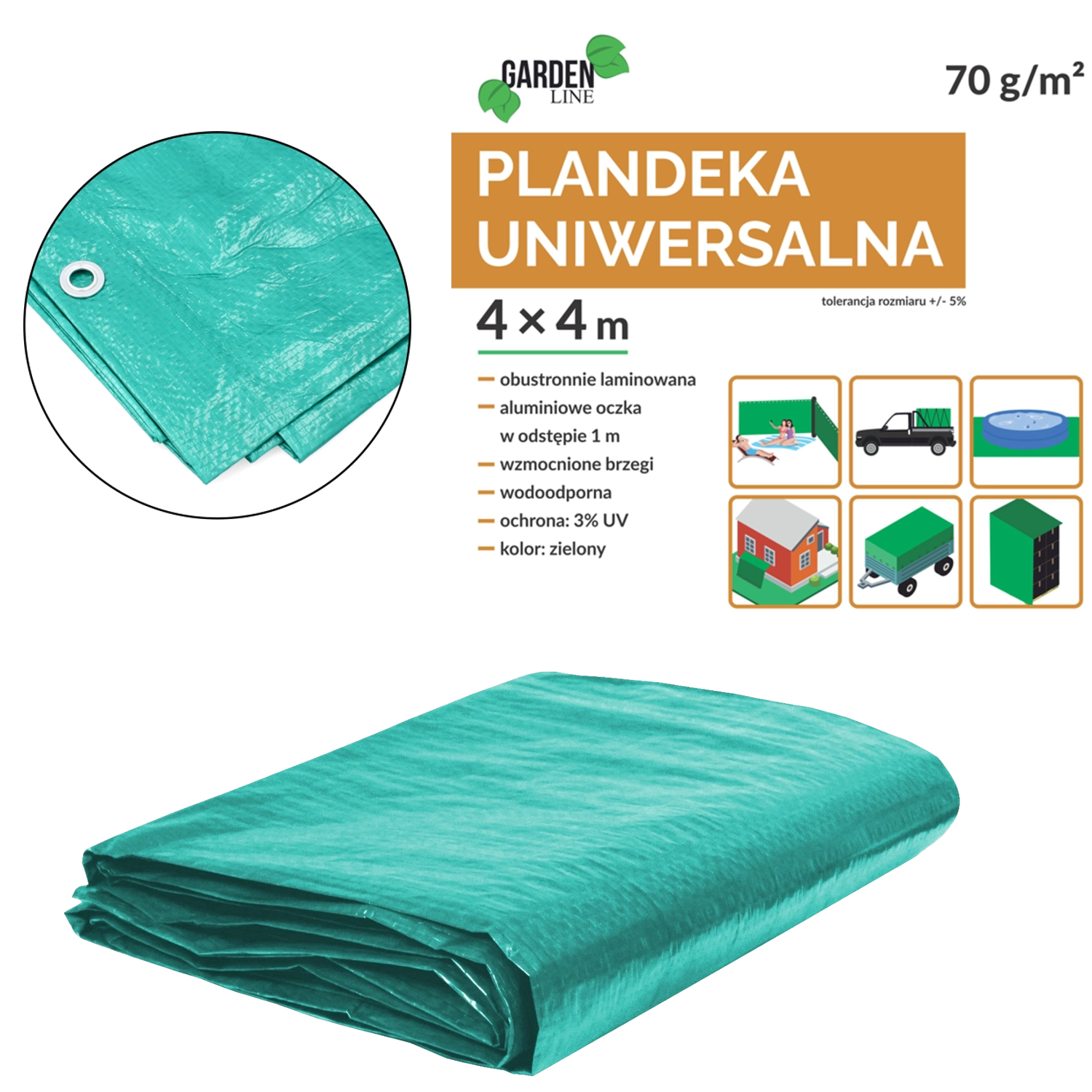 Uniwersalna plandeka ochronna z wysokiej jakości PE o gramaturze 70 g/m² chroni przed deszczem, kurzem i słońcem. Jest laminowana dwustronnie, ma wzmocnione krawędzie ze sznurem oraz aluminiowe oczka co 1 m. W kolorze zielonym, ochrona UV 3%, wymiary 4 × 4 m (+/−5%).