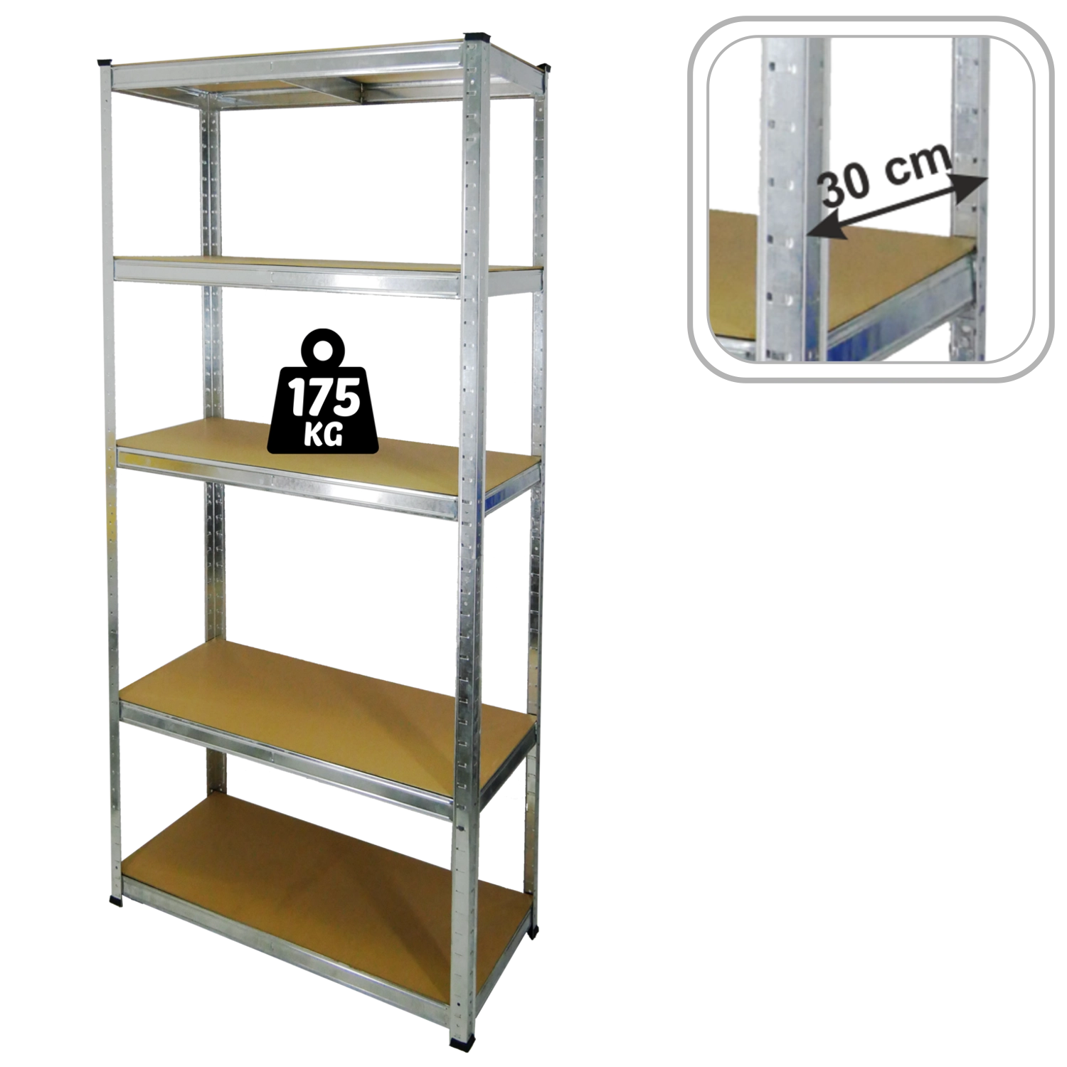 Każda z 5 półek udźwignie do 175 kg przy równomiernym rozłożeniu obciążenia – idealne na cięższe narzędzia, pudła i zapasy.