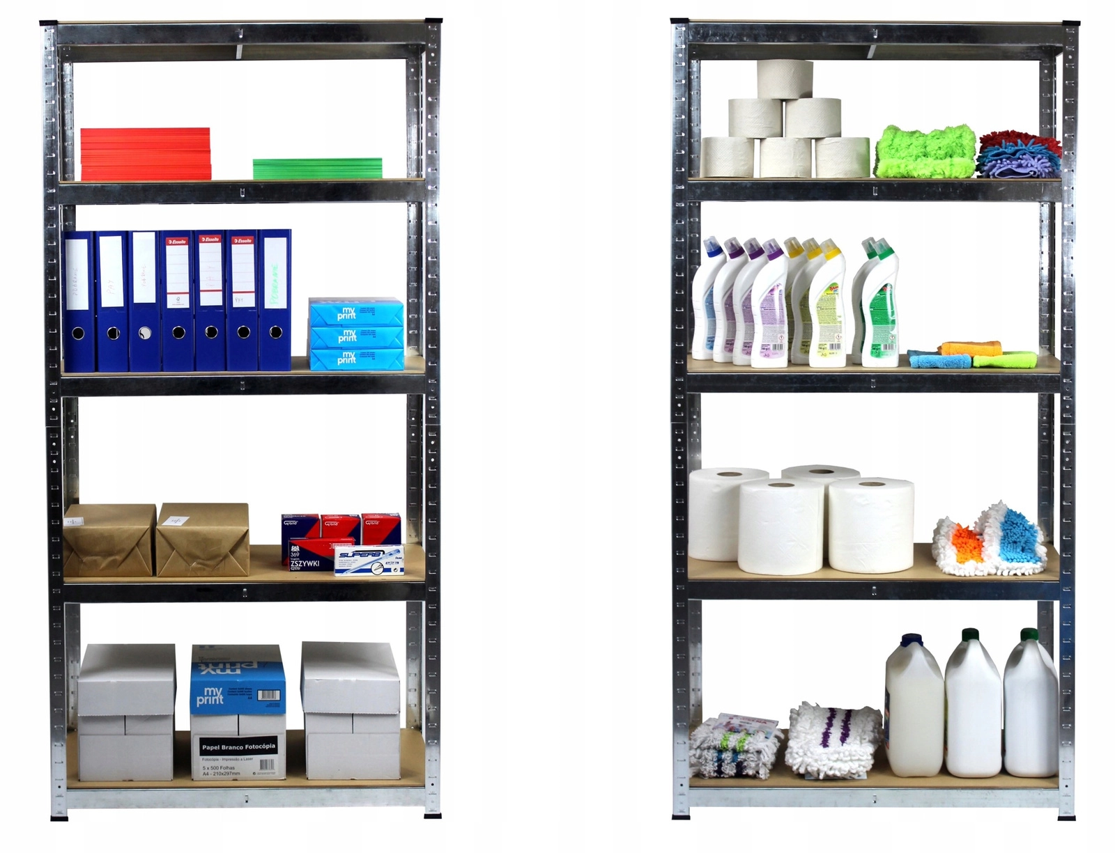 Uniwersalny pięciopółkowy regał z solidną stalową konstrukcją i półkami z HDF oferuje wysoką nośność 175 kg na półkę, stabilność dzięki wzmocnieniom oraz łatwy montaż bez komplikacji. Idealny do warsztatu, garażu, piwnicy i biura do przejrzystego i bezpiecznego przechowywania narzędzi, pudeł i zapasów.