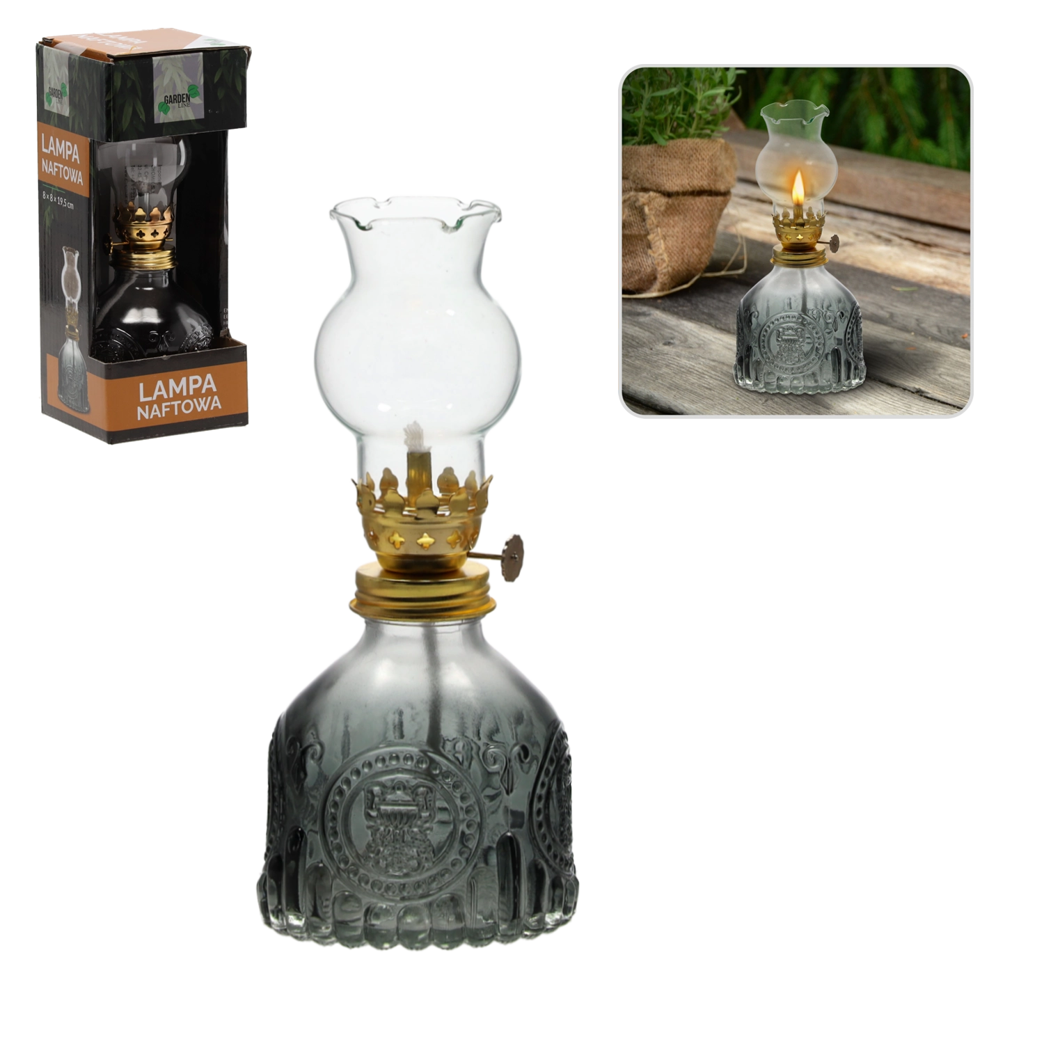 Odkryj urok tradycyjnego oświetlenia. Szklana lampa naftowa łączy elegancki wygląd z funkcjonalnością. Doskonale sprawdzi się jako element dekoracyjny w salonie, sypialni lub w ogrodzie, gdzie stworzy przytulną atmosferę z delikatnym, ciepłym blaskiem.