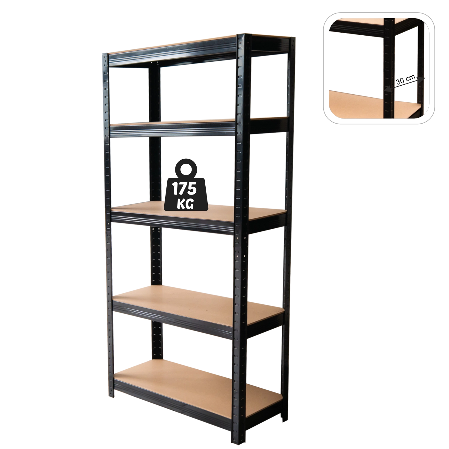 Każda półka udźwignie do 175 kg (przy równomiernym rozłożeniu), a całkowita nośność regału wynosi 875 kg. Wzmocnienia pod półkami zapewniają maksymalną sztywność i bezpieczeństwo podczas składowania.